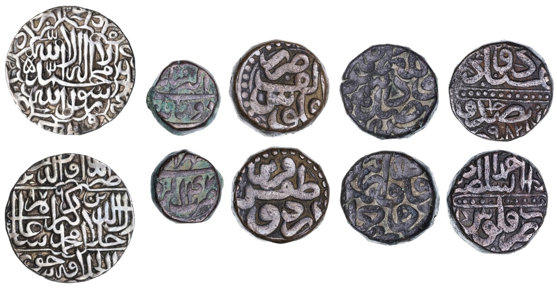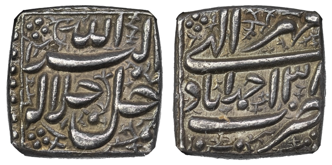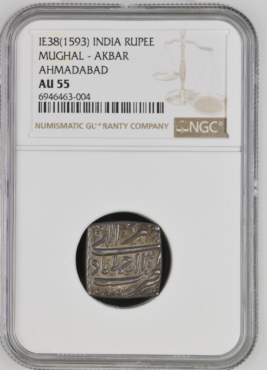 NGC AU55 | Mughal Empire, Akbar (1556-1605), square Ilahi Rupee, 11.47g, Ahmadabad, Ilahi month Mihr, year 38, jallal jalahu allahu Akbar (KM 88.1), toned, about extremely fine, in NGC holder, graded AU55 (Cert. #6946463-004); Rupee, Dar ul-Khilafat Jaunpur, AH 976, on a large flan (KM 80.10), well struck with most of mint readable, toned good very fine; AE Dams (3), Dogaon, date unclear, possibly AH993, Ahmadabad, AH982, Urdu Zafar Qarin, ‘alif’ (1000) (KM 28.19, 29.1, 34), generally very fine, above average for type, AE Damra (Quarter-Dam), Ilahi 47 (KM.2.1), toned very fine (6)