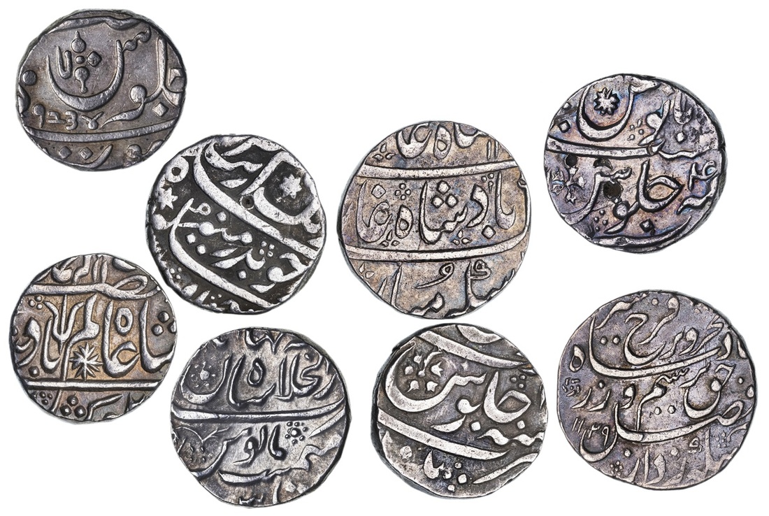 Mughal Empire, Aurangzeb (1658-1707), Rupee, Golkonda, ry.30 (KM 300.28), fine, Farrukhsiyar (1713-19), Rupee, Shahjahanabad, AH1129 / 6 (KM 377.55), toned very fine, Ahmad Shah (1748-54), Rupee, Shahjahanabad, ry.3 (KM 446.17), toned about extremely fine; Maratha Confederacy, Shah 'Alam II, Rupees (3), mint off flan, AH1177, ry.4, with 'scissor' shroff mark, Jhansi, AH1200, Kora, ry.3, star and trident (KM 278), Ahmadabad, ry.21, ankus (KM 50), in his pre-accession name of 'Ali Gauhar, Rupee, Poona, FE 1234 (1824) (KM 214), very fine to extremely fine, some scarce (7)