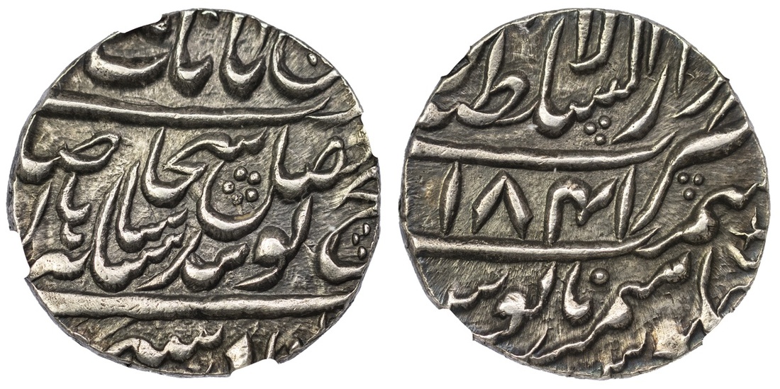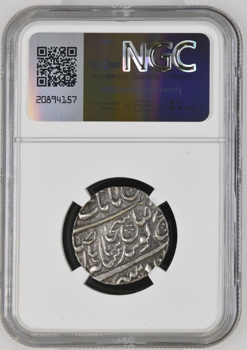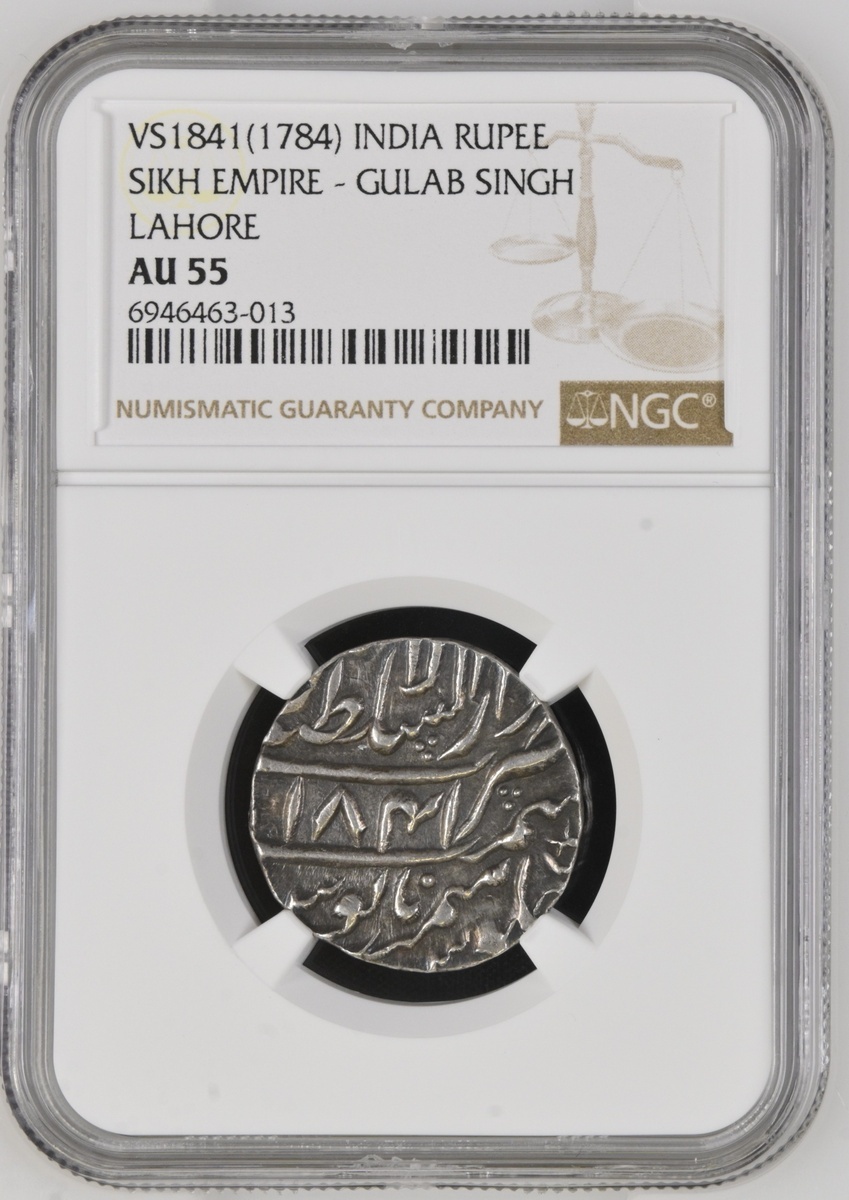 NGC AU55 | Sikh Empire, Misl Period (VS 1822-56; 1765-99), Nanakshahi Rupee, 11.25g, Lahore, VS 1841, broad flan (Herrli 08.04.04; KM 64), beautiful rich cabinet tone, extremely fine, in NGC holder, graded AU55 (Cert. #6946463-013), only one example graded higher by NGC