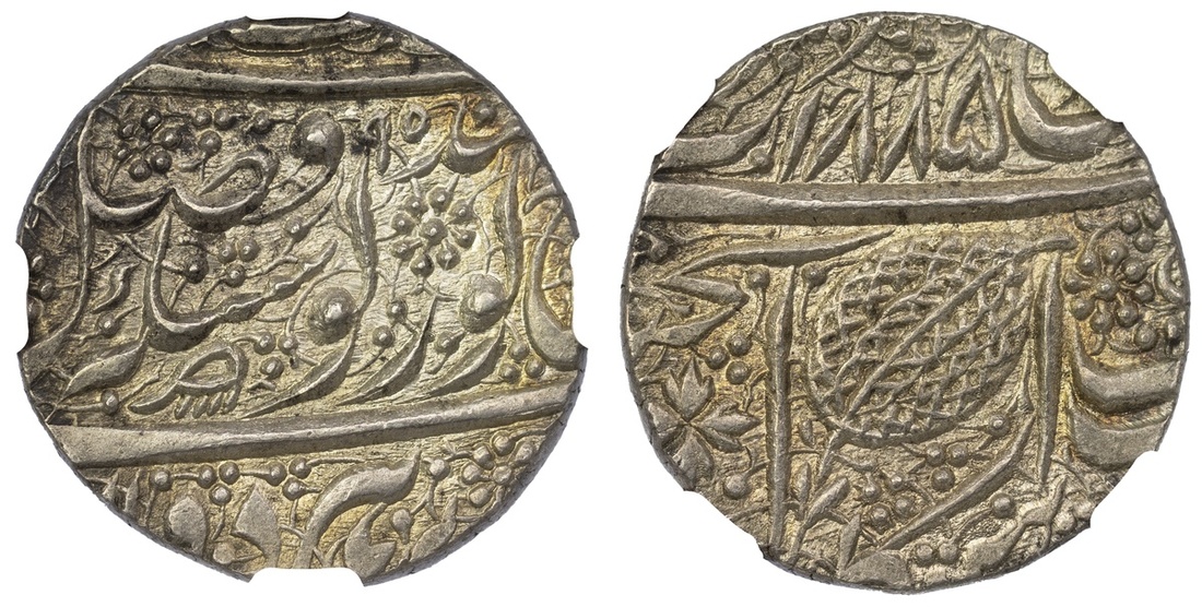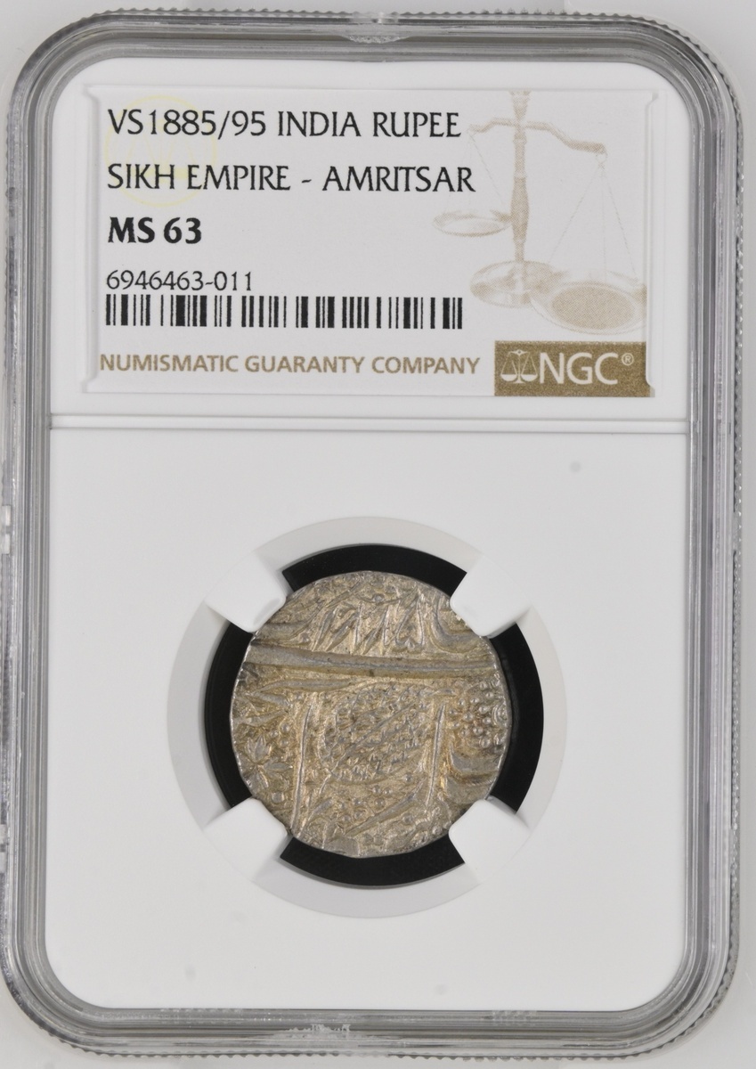 NGC MS63 | Sikh Empire, Ranjit Singh (VS 1856-96; 1799-1839), Nanakshahi Rupee, 11.16g, Amritsar, fixed year VS 1885 / 95, on broad flan (Herrli 01.11.04; Gurprit Singh 01.58.01; KM 22.1), toned, good extremely fine, in NGC holder, graded MS63 (Cert. #6946463-011), only one example in higher grade