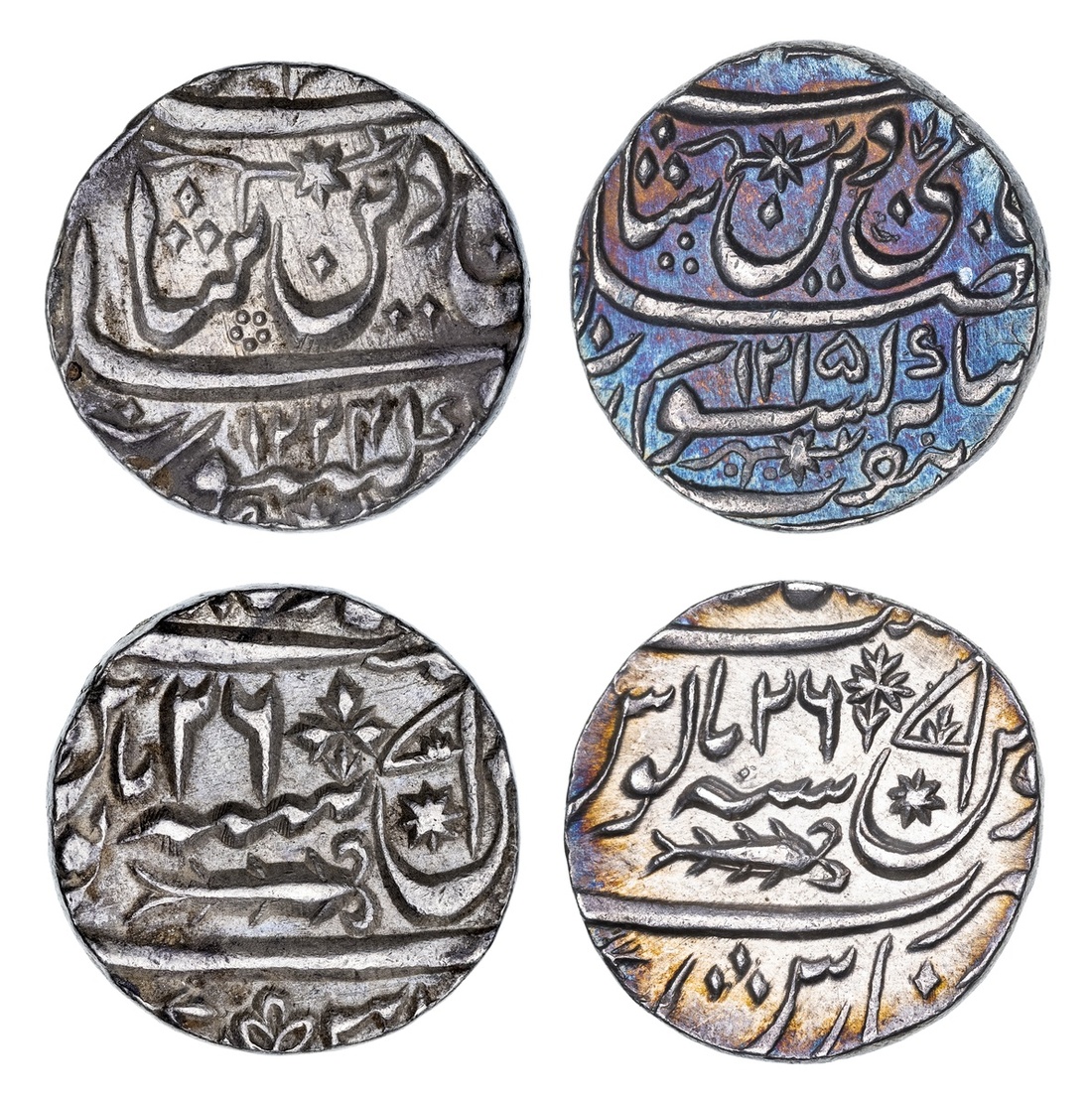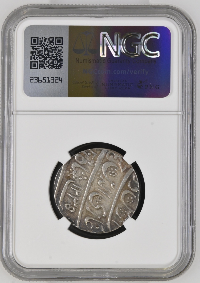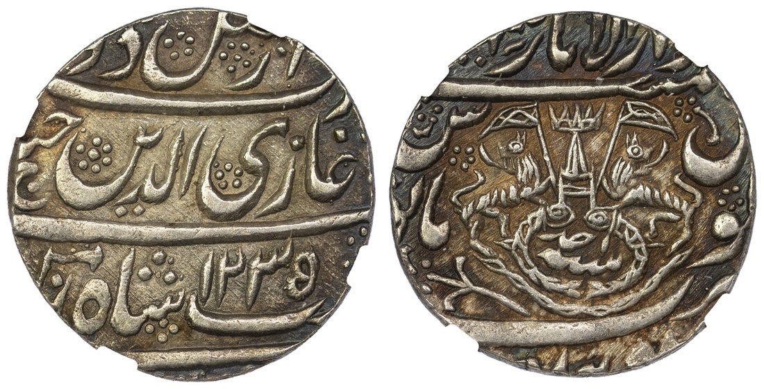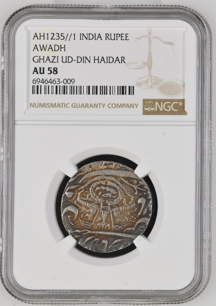 NGC AU58 | Princely States, Awadh, Ghazi ud-Din Haidar (1819-1828) Rupee, 11.15g, Lakhnau suba Awadh, AH1235, ry. ahd, crest of Awadh (KM 165.1), attractive cabinet tone, about extremely fine, in NGC holder, graded  AU58 (Cert. #6946463-009); Awadh, in the name of Shah 'Alam II, Rupees (2), Lucknow (Banaras), AH1215 / 26, AH1224 / 26, fish and flag type with fixed regnal year (KM 103.2), the first with beautiful iridescent tone, good extremely fine, the second extremely fine (3)