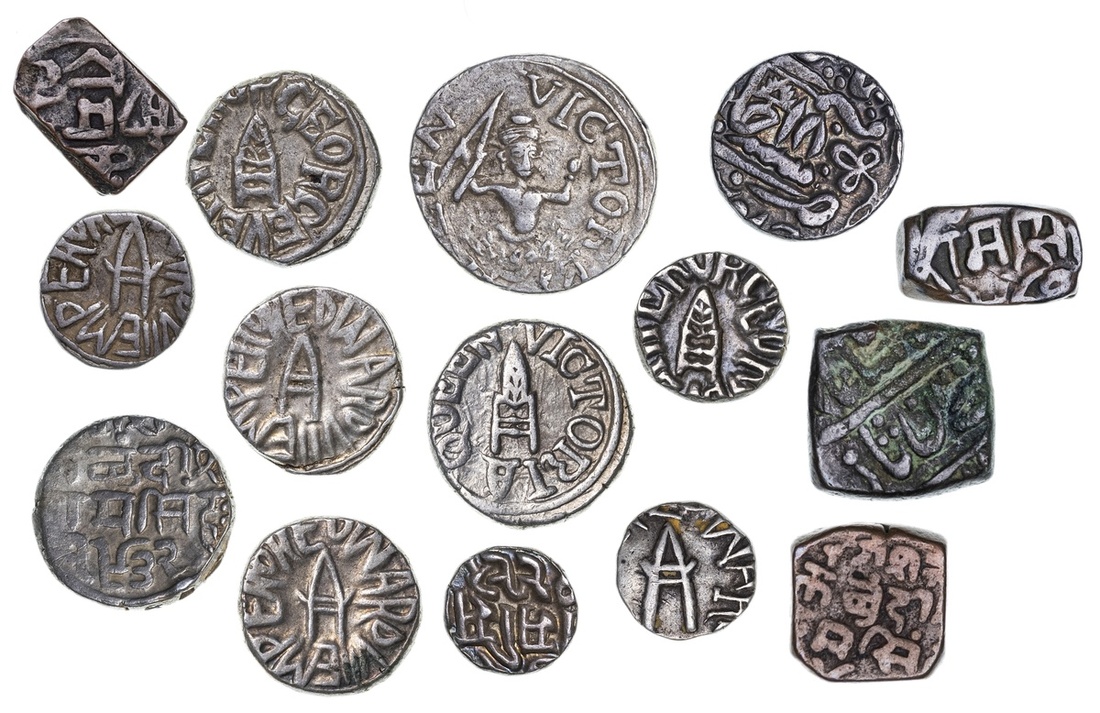 Princely States, Bundi, in the name of Mohammad Akbar II (1806-1837), Rupee, ry. 18, AE Takka, ry.18, leaf spray (KM 17a, 30), both about very fine, the first with a couple of test punches on edge; Queen Victoria (1837-1901), Rupees (3), naming Queen Victoria in English, the first with no image, VS 1932 / 1875, the second with legend around a katar, VS 1946, the third with legend around figure holding a katar, VS 1958, AE Takka, 1882; Edward VII (1901-1910), Rupees (2), naming Edward Emperor in English around a katar, VS 1964, 1965, Half-Rupee, VS 1964, Quarter-Rupee, VS1964, AE Half-Paisa, George V (1910-1936), Rupee, naming George Emperor in English around a katar, VS 1980, Half-Rupee, VS 1981, Quarter-Rupee, VS 1982, AE Half-Paisa (KM Y#A2, 3, 6, 9, 10, 12, 13, 14, 15.2, 16.2, 17.2,18.2), silver coins generally very fine or a little better, paisas fine to very fine (15)