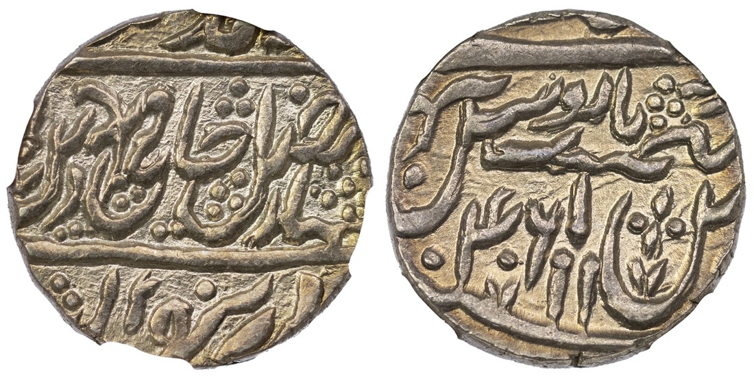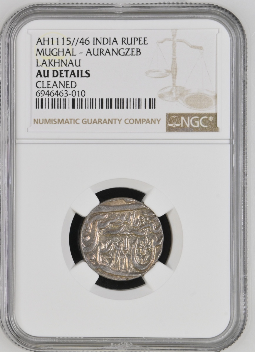 NGC AU | Independent States, Rohilla Chieftaincies, in the name of Shah 'Alam II Rupee, 11.02g, Ghausgarh mint, 'pseudo' mint name Najibabad, ry.46, katar by regnal year (KM 96.2), wiped, otherwise toned, about extremely fine, in NGC holdder, graded AU Details ~ cleaned, wrongly described (Cert. #6946463-010)
