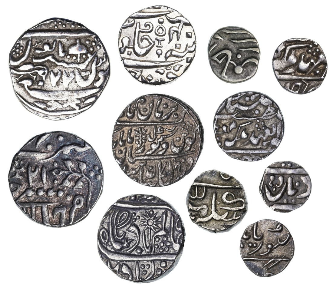 Princely States (18th-early 20th century), silver Coins (12), a good variety of scarce and interesting types: Chhatarpur, Rupee, in the name of Shah 'Alam II, yr.5, unusual floral design (KM 15), a rare and attractive coin, extremely fine; Jaipur, Quarter-Rupee, ry.25, 1/8-Rupee, ry.6, both name Queen Victoria and Ram Singh, but the latter has regnal year of Muhammad Akbar (KM 65/110, 111), good very fine; Jaisalmir, Rupee, hexagonal, 1/8-Rupee, fixed ry.22, bird (KM 31, 34a), very fine, the first rare; Jhalawar, Rupee, yr.21, 1/8-Rupee, yr. 32, leaf spray (KM 3.2, 6.1), both toned, the first very fine, the second extremely fine and scarce; Jodhpur, Rupee, AH1291, ry.22, sword / legend 'ali before leaf spray (KM 76), good very fine; Karauli, Rupee, 1852, ry.13, katar and leaf spray (KM 44.2), a striking coin, well toned, good very fine; Orchha, Gaja Shahi Rupee, ry.40, mace and floral sprigs (KM 32), cleaned, good extremely fine (11)