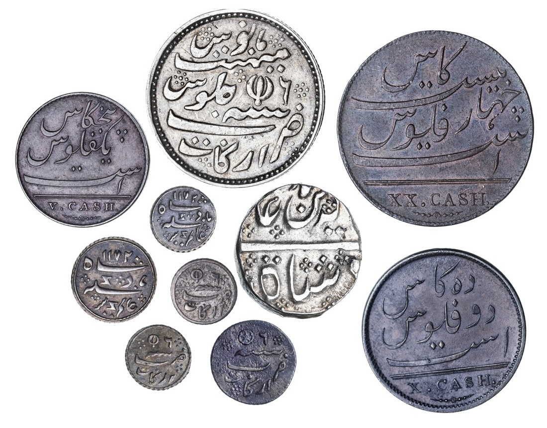 East India Company, Madras Presidency, in the name of Alamgir II, Dump Rupee, Arcot, fixed ry 6, milled Rupee, fixed year AH1172, ry 6, lotus, indented cord milling on edge, 1/8-Rupees (2), one with closed lotus, one with rose, 1/16-Rupees (3), two with closed lotus, one with rose, all in the name of 'Alamgir II, AH1172 / 6 (KM 384, 410, 411, 412, 423, 424), very fine or better; Soho Mint, AE XX, X-Cash, 1808, both lightweight issues, V-Cash, 1803 (KM 316, 319, 321; Pr. 197, 206, 208), about extremely fine (10)