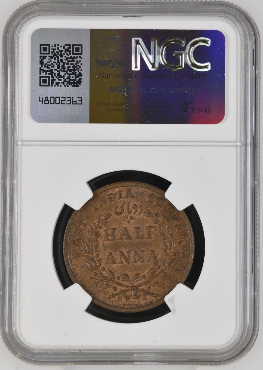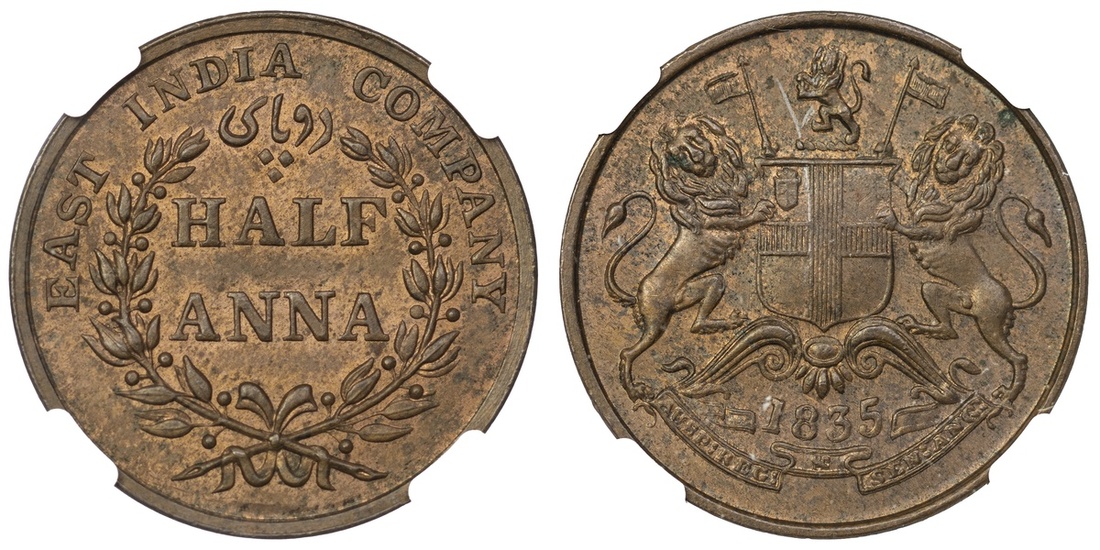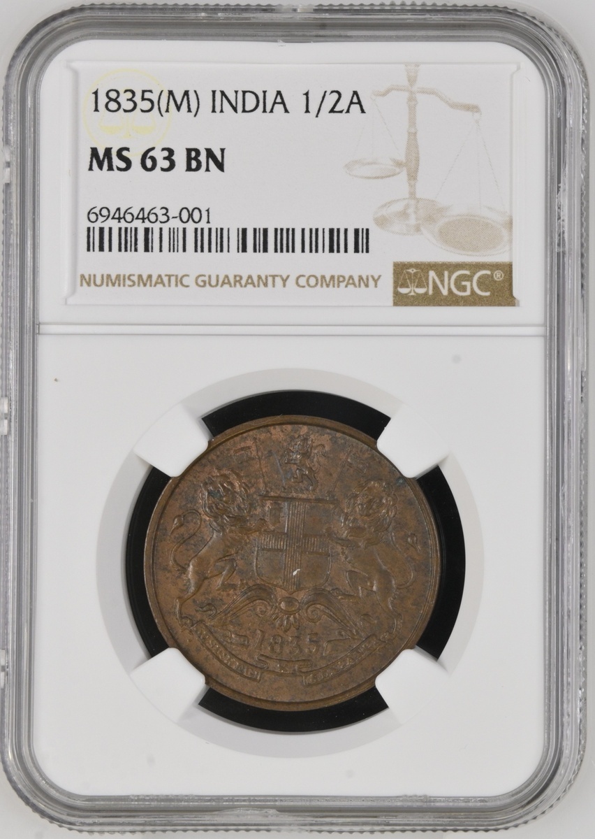 NGC MS63 BN | India, East India Company, AE Half-Anna, 1835, Madras, type B /II, broad flat borders both sides (S & W 1.83; Pr.133; KM 447.1), with areas of mint red, nearing uncirculated, in NGC holder graded MS63 BN (Cert. #6946463-001)