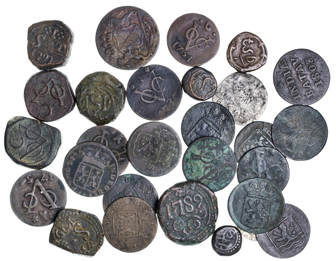 Netherlands East Indies, Ceylon, Dump AE issues, 2-Stuiver, Galle, 1789, 1-Stuivers (4), Trincomalee, 1791, 1792, Colombo, 1783, 1786, wreath Stuiver, ¼-Stuivers (2), Colombo, value in wreath, undated (c.1712), ¼-Stuiver, 'C' above VOC, undated (c.1783) (KM 19.1, 25, 26, 30, 34; Scholten 1290, 1292, 1296, 1299, 1309,1334, 1350, 1351), about fine to very fine; Batavian Republic, AR 1/16-Gulden, 1802, Duit, 1808 (KM 76, 77; Scholten 495, 557), the first good very fine, the second fine; Zeelandia, AR 2-Stuivers, 1617, a shipwreck coin found off Galle, fair, VOC Duits (3), 1749, 1754, 1766; Utrecht, VOC 2-Duits, Duit, both dated 1790, but the first issued 1840-43, ½-Duit, 1852, Holland, VOC Duits (3), 1745, 1748, 1750, Gelderland, VOC Duits (4), 1776, 1786 (2), 1791, West Friesland, VOC Duits (2), 1754, 1780 (KM 70, 111.1, 112.1, 118,131, 152.1), fair to fine; together with another Duit of Java, 1810 and a contemporary copy of a Duit, good fine (29)