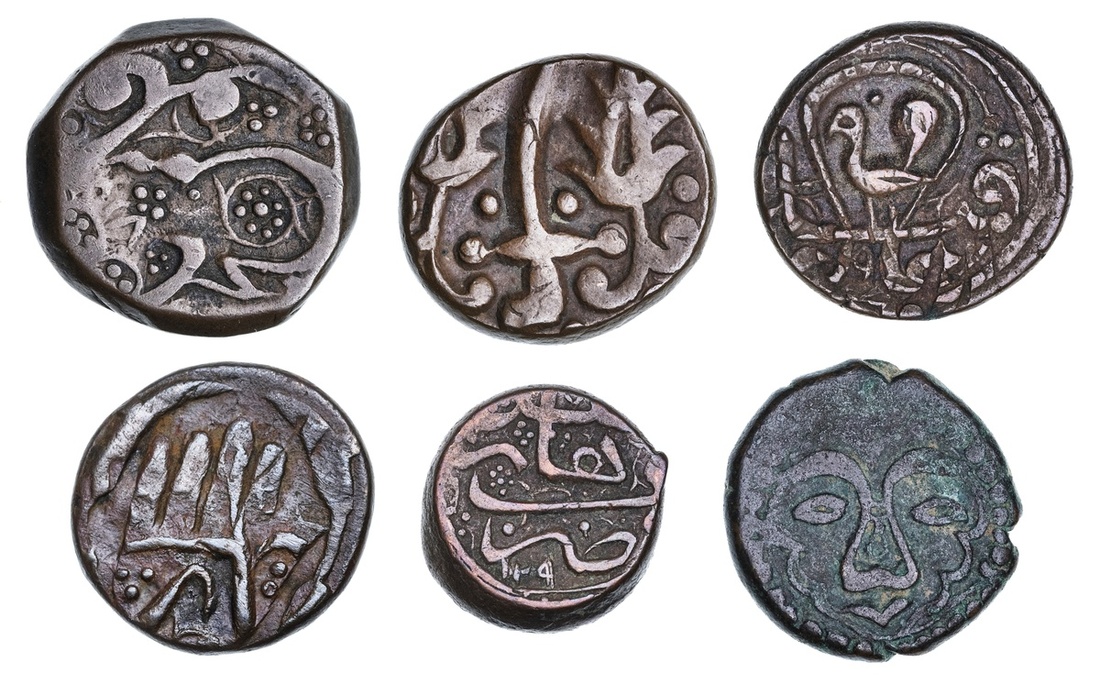 Afghanistan, Second Anglo-Afghan War, British Occupation of Qandahar (1878-1880), Æ Fulus, Qandahar, AH129[6] (AD 1878/9), British crown within wreath / mint name in Arabic (Album 3253; KM 94; SICA 9 1080), a key coin of the Afghan series in above-average condition, very fine; together with other iconic AE Fulus of 19th century Afghanstan (5), Ahmadshahi, AH(1)257, scimitar between two leaves, Balkh, AH(12)71, leaf between two scimitars, Herat, AH(122)7, human face, Qandahar (2), 'Hand of 'Ali', peacock, AH1297 (KM 27, 37, 44, 91, 96), a pleasing and interesting group of scarce issues, generally very fine or better (6)