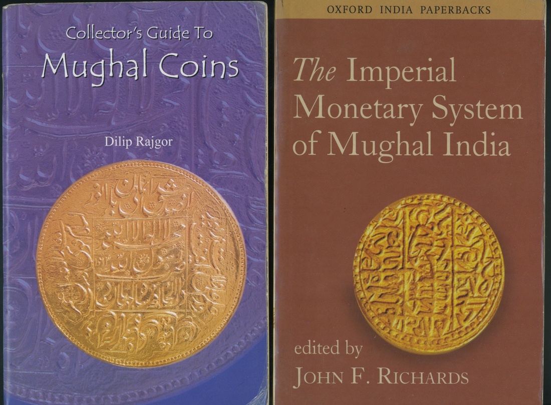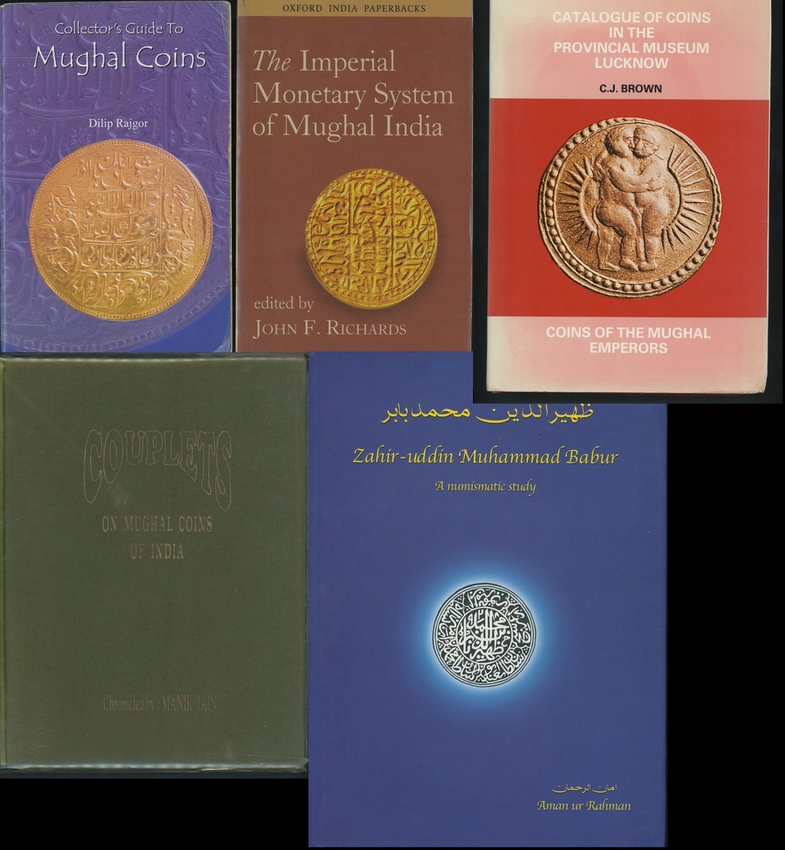 Mughal Empire, Books (5) | Zahir-uddin Muhammad Babur, A Numismatic Study, Ur-Rahman, A., Art Vision, Karachi, Pakistan, 2005 (First Edition limited to 1000 copies), with undamaged dust cover, good condition; and Coins of the Mughal Emperors, Catalogue of Coins in the Provincial Museum Lucknow, Brown, C.J., Volumes I & II, 1986 reprint of OUP publications of 1920, published by R.C. Senior Ltd, with dust cover undamaged but faded, pages also slightly yellowed, otherwise good condition; and, Couplets on Mughal Coins of India, Jain, M., Philatelia, Calcutta, 1998 (First Deluxe Edition, limited to 1000 copies), a most attractive book, each page is dedicated to a different couplet and finished with an illuminated border, padded fabric cover within original protective clear cover, good condition and a lovely book to own; and, The Imperial Monetary System of Mughal India, essays on the subject, Ed. Richards, John, F., Oxford University Press, New Delhi, Paperback Edition, 2000, covered in protective plastic, pages a little faded, otherwise good condition; and, Collector’s Guide to Mughal Coins, Rajgor, D., Dinesh Mody Numismatic Museum, 2002, a thin but extremely useful book, and hence well-thumbed, paperback booklet, not in collectable condition