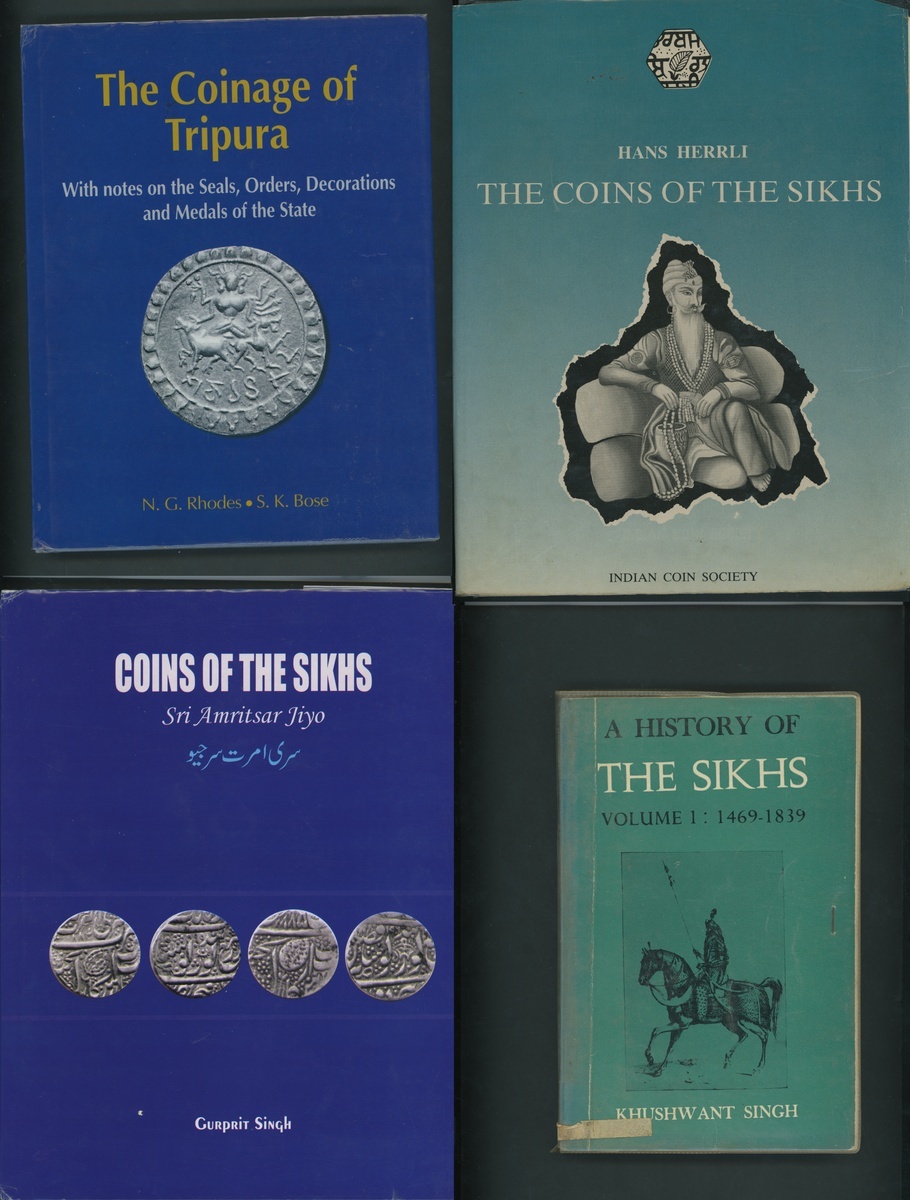 Sikh & N. India, Books (4) | The Coins of the Sikhs, Herrli, H., Indian Coin Society, Nagpur, First Edition 1993, with snagging to dust cover at corners, pages a little faded, otherwise in reasonable condition; and, Coins of the Sikhs, A Catalogue of the Silver Coins of Amritsar Mint, Singh, G., Nanakshahi Trust, First Edition 2015, with dust jacket and pages in good condition, almost as new; and, The Coinage of Tripura, Rhodes, N.G., Bose, S.K., Mira Bose, Kolkata, 2002, with intact dust cover covered in protective film, good condition; and, A History of the Sikhs, Volume 1: 1469-1839, Singh, K., Oxford University Press, Delhi, Third edition, 1981, softback, ex public library, pages yellowed, within a plastic cover.