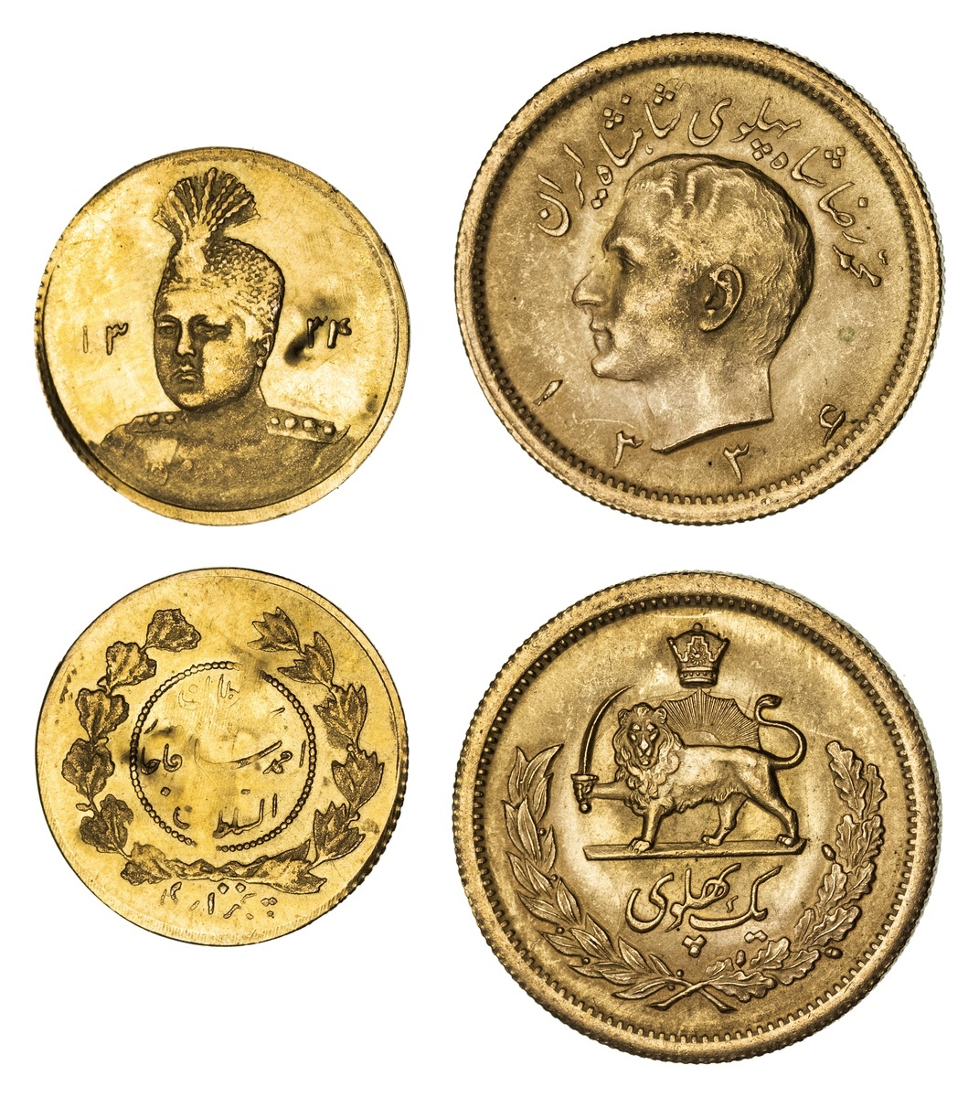 Persia, Pahlavi Dynasty, Mohammad Reza Shah (1941-1979), Pahlavi, AH 1336 (1957), bare head left, rev. lion in wreath, milled edge, 2h, 8.10g (Fr 101; KM 1162), some lustre beneath mostly matte-like surfaces, good very fine; Persia, Qajar Dynasty, Ahmad Shah (1909-1925), 1/5 Toman, AH 1334 (1916), uniformed bust three-quarters left, rev. legend in wreath, plain edge, 12h, 0.82g (Fr 86; KM 1070), crimped and soft in parts, yet lustrous, very fine (2)