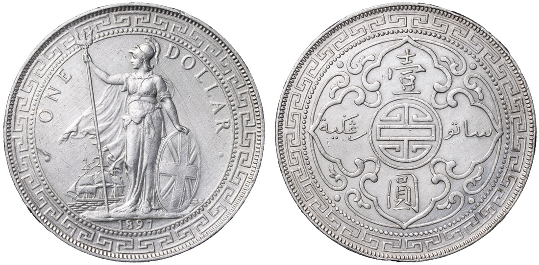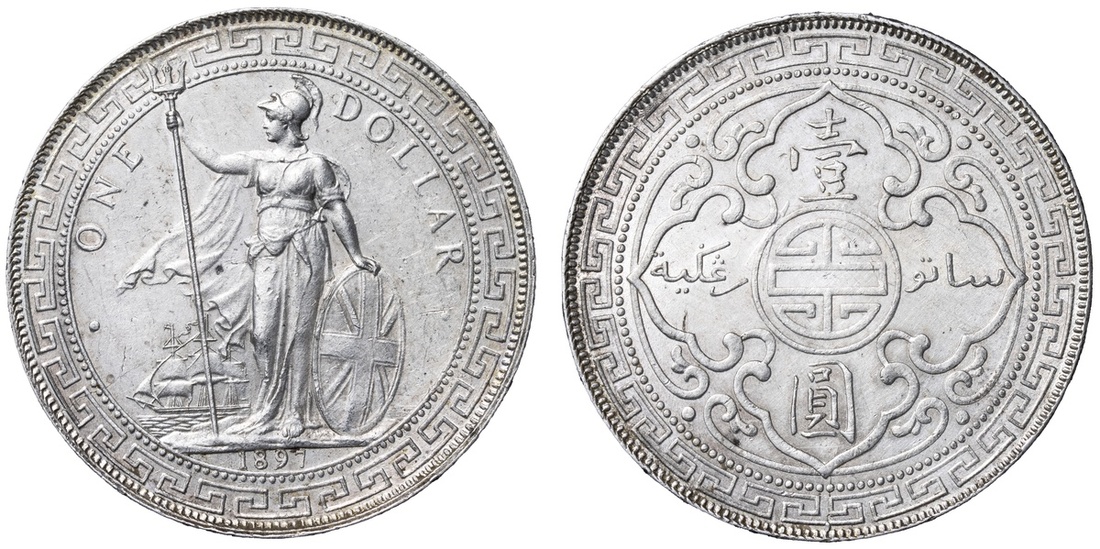 British Overseas Territories, Straits Settlements and Hong Kong (1895-1935), British Trade Dollar, 1897 B, 'Low 7', Bombay Mint, by George William de Saulles, Britannia standing left, holding trident, cape billowing behind, date in exergue, rev. Chinese characters and Jawi script in ornamental flower, edge milled, 12h (Mars BTD1; Prid. 5; KM T5), struck with a rusted obverse die, with a purple-orange tone overlying lustrous original surfaces, a really pleasingly good very fine; British Trade Dollar, 1897 B, 'Low 7', Bombay Mint, by George William de Saulles, Britannia standing left, holding trident, cape billowing behind, date in exergue, rev. Chinese characters and Jawi script in ornamental flower, edge milled, 12h (Mars BTD1; Prid. 5; KM T5), light hairlines in otherwise lustrous fields, a pleasing extremely fine; British Trade Dollar, 1897 B, 'Low 7', Bombay Mint, by George William de Saulles, Britannia standing left, holding trident, cape billowing behind, date in exergue, rev. Chinese characters and Jawi script in ornamental flower, edge milled, 12h (Mars BTD1; Prid. 5; KM T5), lightly cleaned otherwise lustrous, extremely fine; British Trade Dollar, 1897 B, 'Low 7', Bombay Mint, by George William de Saulles, Britannia standing left, holding trident, cape billowing behind, date in exergue, rev. Chinese characters and Jawi script in ornamental flower, edge milled, 12h (Mars BTD1; Prid. 5; KM T5), cleaned with peripheral toning, otherwise lustrous, almost extremely fine (4)
