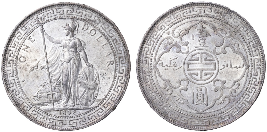 British Overseas Territories, Straits Settlements and Hong Kong (1895-1935), British Trade Dollar, 1898 B, Bombay Mint, by George William de Saulles, Britannia standing left, holding trident, cape billowing behind, date in exergue, rev. Chinese characters and Jawi script in ornamental flower, edge milled, 12h (Mars BTD1; Prid. 6; KM T5), light bagmarks and patchy tone, otherwise almost extremely fine