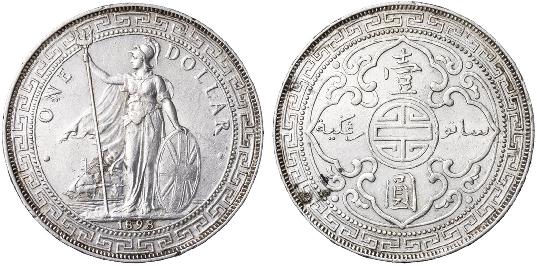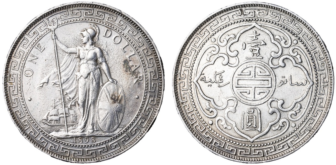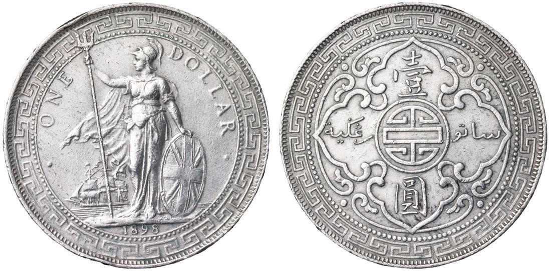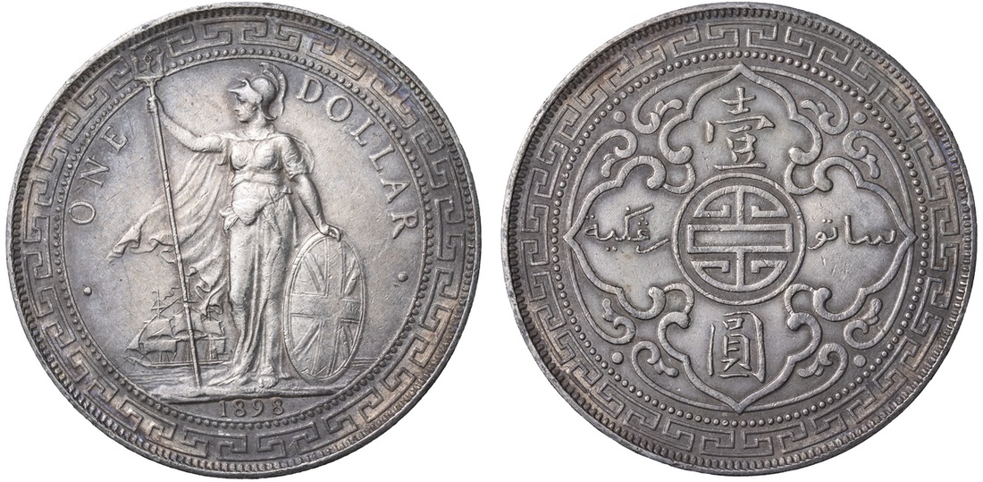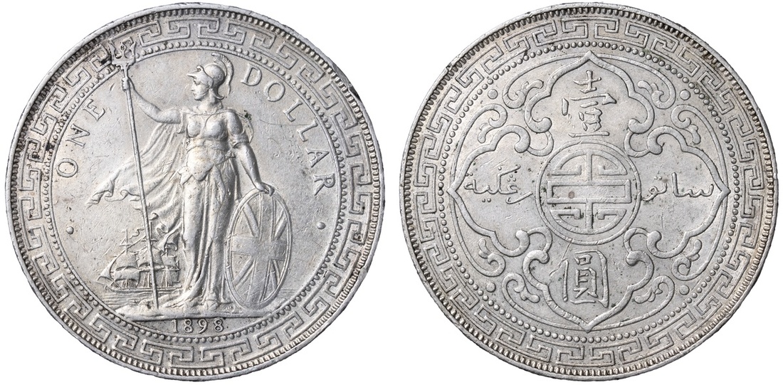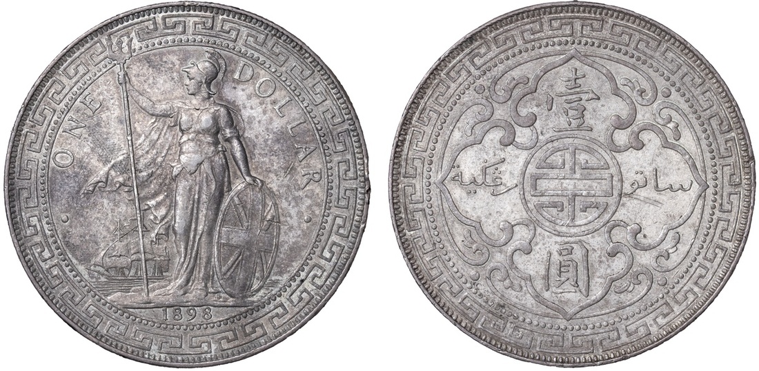 British Overseas Territories, Straits Settlements and Hong Kong (1895-1935), British Trade Dollar, 1898 B, Bombay Mint, by George William de Saulles, Britannia standing left, holding trident, cape billowing behind, date in exergue, rev. Chinese characters and Jawi script in ornamental flower, edge milled, 12h (Mars BTD1; Prid. 6; KM T5), lightly cleaned but lustrous, a really bold very fine / extremely fine; British Trade Dollar, 1898 B, Bombay Mint, by George William de Saulles, Britannia standing left, holding trident, cape billowing behind, date in exergue, rev. Chinese characters and Jawi script in ornamental flower, edge milled, 12h (Mars BTD1; Prid. 6; KM T5), lightly cleaned but lustrous, a bolder very fine / extremely fine; British Trade Dollar, 1898 B, Bombay Mint, by George William de Saulles, Britannia standing left, holding trident, cape billowing behind, date in exergue, rev. Chinese characters and Jawi script in ornamental flower, edge milled, 12h (Mars BTD1; Prid. 6; KM T5), mottled tone overlying lustrous fields, almost extremely fine; British Trade Dollar, 1898 B, Bombay Mint, by George William de Saulles, Britannia standing left, holding trident, cape billowing behind, date in exergue, rev. Chinese characters and Jawi script in ornamental flower, edge milled, 12h (Mars BTD1; Prid. 6; KM T5), cleaned and partially retoned, a bolder very fine; British Trade Dollar, 1898 B, Bombay Mint, by George William de Saulles, Britannia standing left, holding trident, cape billowing behind, date in exergue, rev. Chinese characters and Jawi script in ornamental flower, edge milled, 12h (Mars BTD1; Prid. 6; KM T5), scuffed to rim at 2 o'clock, otherwise lightly cleaned and bagmarked but lustrous, a bolder very fine / extremely fine; British Trade Dollar, 1898 B, Bombay Mint, by George William de Saulles, Britannia standing left, holding trident, cape billowing behind, date in exergue, rev. Chinese characters and Jawi script in ornamental flower, edge milled, 12h (Mars BTD1; Prid. 6; KM T5), edge bruises and cleaned, very fine / a bold very fine (6)