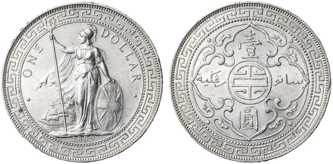 British Overseas Territories, Straits Settlements and Hong Kong (1895-1935), British Trade Dollar, 1899 B, Bombay Mint, by George William de Saulles, Britannia standing left, holding trident, cape billowing behind, date in exergue, rev. Chinese characters and Jawi script in ornamental flower, edge milled, 12h (Mars BTD1; Prid. 8; KM T5), choice mint state