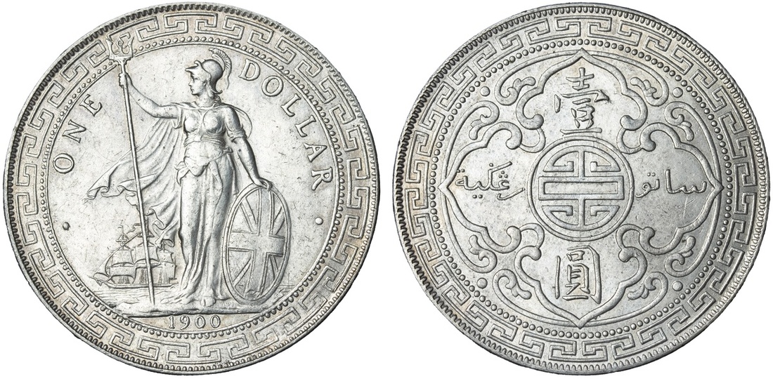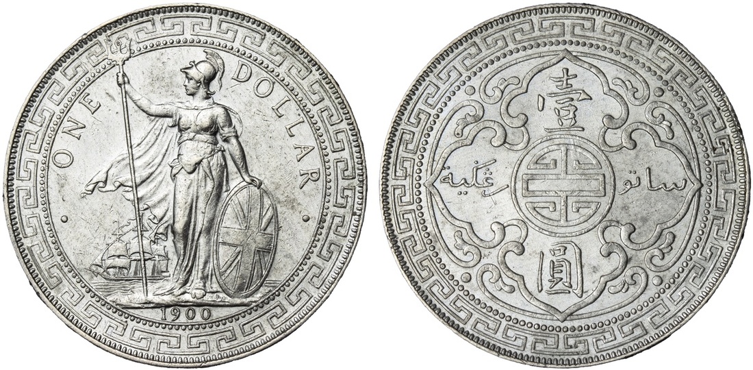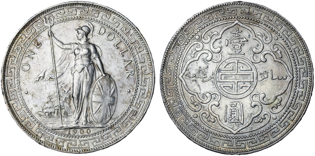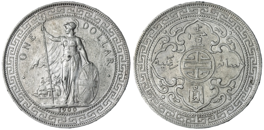 British Overseas Territories, Straits Settlements and Hong Kong (1895-1935), British Trade Dollar, 1900 B, Bombay Mint, by George William de Saulles, Britannia standing left, holding trident, cape billowing behind, date in exergue, rev. Chinese characters and Jawi script in ornamental flower, edge milled, 12h (Mars BTD1; Prid. 8; KM T5), lightly cleaned, with partial peripheral tone, a bold very fine; British Trade Dollar, 1900 B, Bombay Mint, by George William de Saulles, Britannia standing left, holding trident, cape billowing behind, date in exergue, rev. Chinese characters and Jawi script in ornamental flower, edge milled, 12h (Mars BTD1; Prid. 8; KM T5), cleaned, a really bold very fine; British Trade Dollar, 1900 B, Bombay Mint, by George William de Saulles, Britannia standing left, holding trident, cape billowing behind, date in exergue, rev. Chinese characters and Jawi script in ornamental flower, edge milled, 12h (Mars BTD1; Prid. 8; KM T5), lightly cleaned but residually lustrous, a pleasingly bold very fine / extremely fine; British Trade Dollar, 1900 B, Bombay Mint, by George William de Saulles, Britannia standing left, holding trident, cape billowing behind, date in exergue, rev. Chinese characters and Jawi script in ornamental flower, edge milled, 12h (Mars BTD1; Prid. 8; KM T5), harshly cleaned but lustrous, a bolder very fine (4)