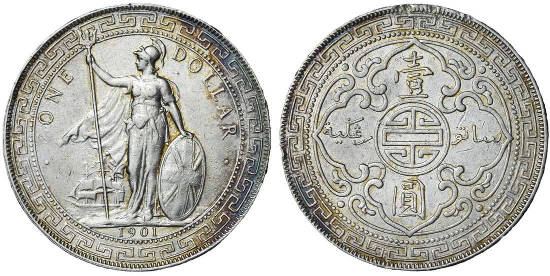 British Overseas Territories, Straits Settlements and Hong Kong (1895-1935), British Trade Dollar, 1901 C, Calcutta Mint, by George William de Saulles, Britannia standing left, holding trident, cape billowing behind, date in exergue, rev. Chinese characters and Jawi script in ornamental flower, edge milled, 12h (Mars BTD1; Prid. 12; KM T5), removed from a mount with solder at 12 o'clock, and lightly cleaned with residual colourful peripheral hues, struck details very fine / a bolder very fine