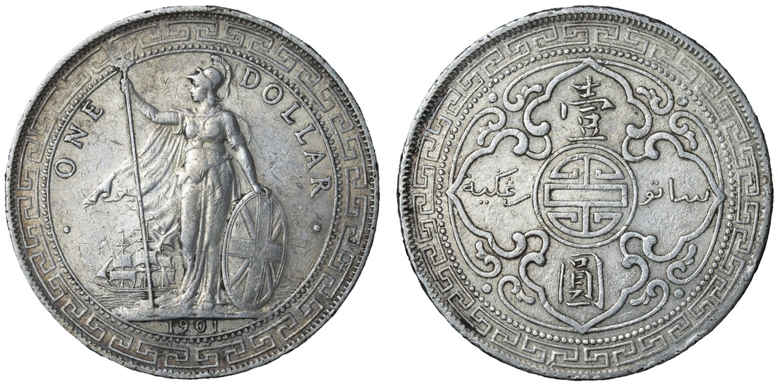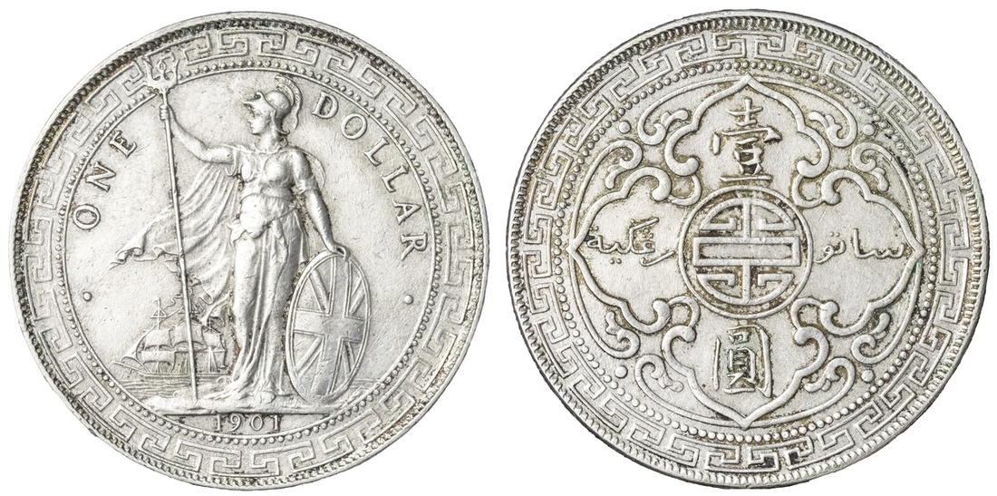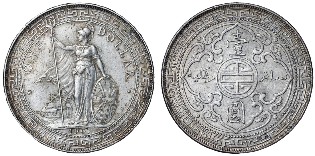 British Overseas Territories, Straits Settlements and Hong Kong (1895-1935), British Trade Dollar, 1901 B, Bombay Mint, by George William de Saulles, Britannia standing left, holding trident, cape billowing behind, date in exergue, rev. Chinese characters and Jawi script in ornamental flower, edge milled, 12h (Mars BTD1; Prid. 11; KM T5), lightly toned and lustrous, otherwise a pleasingly good very fine, the reverse better; British Trade Dollar, 1901 B, Bombay Mint, by George William de Saulles, Britannia standing left, holding trident, cape billowing behind, date in exergue, rev. Chinese characters and Jawi script in ornamental flower, edge milled, 12h (Mars BTD1; Prid. 11; KM T5), cleaned and rubbed, with hints of residual lustre, struck details about very fine; British Trade Dollar, 1901 B, Bombay Mint, by George William de Saulles, Britannia standing left, holding trident, cape billowing behind, date in exergue, rev. Chinese characters and Jawi script in ornamental flower, edge milled, 12h (Mars BTD1; Prid. 11; KM T5), lightly cleaned but lustrous, otherwise a pleasingly bold very fine (3)