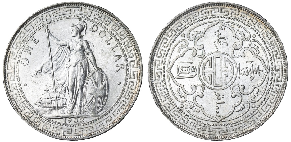 British Overseas Territories, Straits Settlements and Hong Kong (1895-1935), British Trade Dollar, 1902 B, Bombay Mint, by George William de Saulles, Britannia standing left, holding trident, cape billowing behind, date in exergue, rev. Chinese characters and Jawi script in ornamental flower, edge milled, 12h (Mars BTD1; Prid. 13; KM T5), highly superficial bagmarks, otherwise cartwheel lustrous, choice as struck