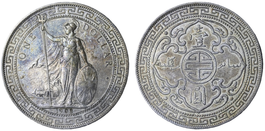 British Overseas Territories, Straits Settlements and Hong Kong (1895-1935), British Trade Dollar, 1902 C, Calcutta Mint, by George William de Saulles, Britannia standing left, holding trident, cape billowing behind, date in exergue, rev. Chinese characters and Jawi script in ornamental flower, edge milled, 12h (Mars BTD1; Prid. 14; KM T5), lightly wiped but lustrous and richly toned, a bolder very fine, a scarcer variety