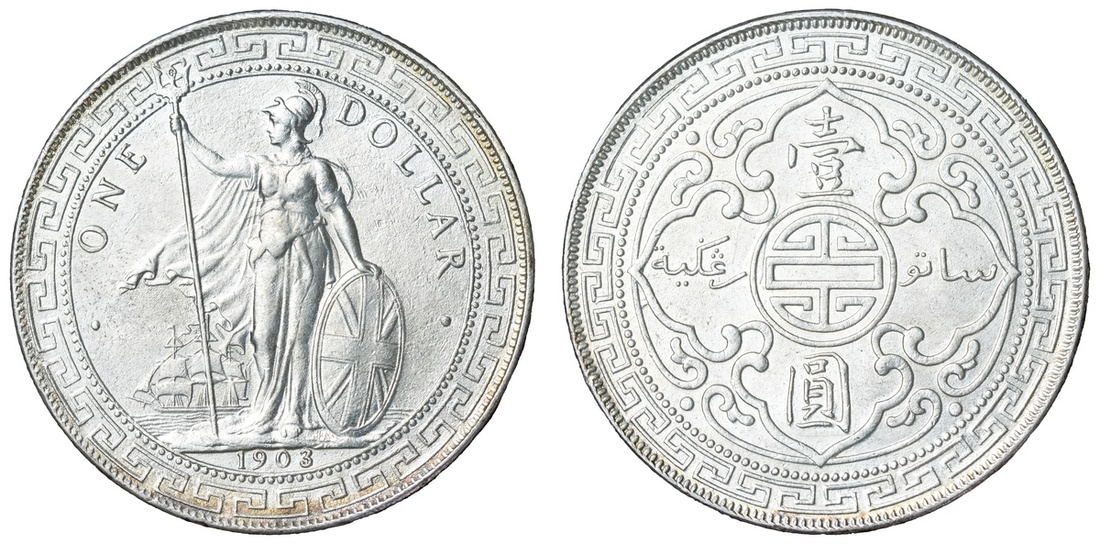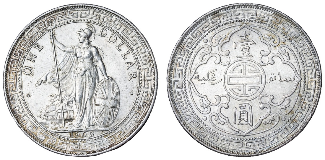 British Overseas Territories, Hong Kong (1895-1935), British Trade Dollar, 1903/2 B, Bombay Mint, by George William de Saulles, Britannia standing left, holding trident, cape billowing behind, date in exergue, rev. Chinese characters and Jawi script in ornamental flower, edge milled, 12h (Dav. 407; Mars BTD1; Prid. 15 variety; KM T5), lightly toned but cartwheel lustrous, good extremely fine, the overdate clear; British Trade Dollar, 1903/2 B, Bombay Mint, by George William de Saulles, Britannia standing left, holding trident, cape billowing behind, date in exergue, rev. Chinese characters and Jawi script in ornamental flower, edge milled, 12h (Dav. 407; Mars BTD1; Prid. 15 variety; KM T5), lightly cleaned but residually lustrous, a bolder very fine, the overdate clear (2)