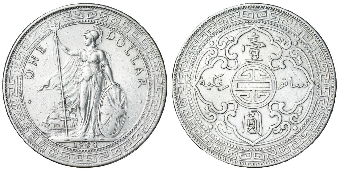 British Overseas Territories, Hong Kong (1895-1935), British Trade Dollar, 1904 B, Bombay Mint, by George William de Saulles, Britannia standing left, holding trident, cape billowing behind, date in exergue, rev. Chinese characters and Jawi script in ornamental flower, edge milled, 12h (Dav. 407; Mars BTD1; Prid. 15; KM T5), lightly cleaned and hairlined, very fine / a bolder very fine