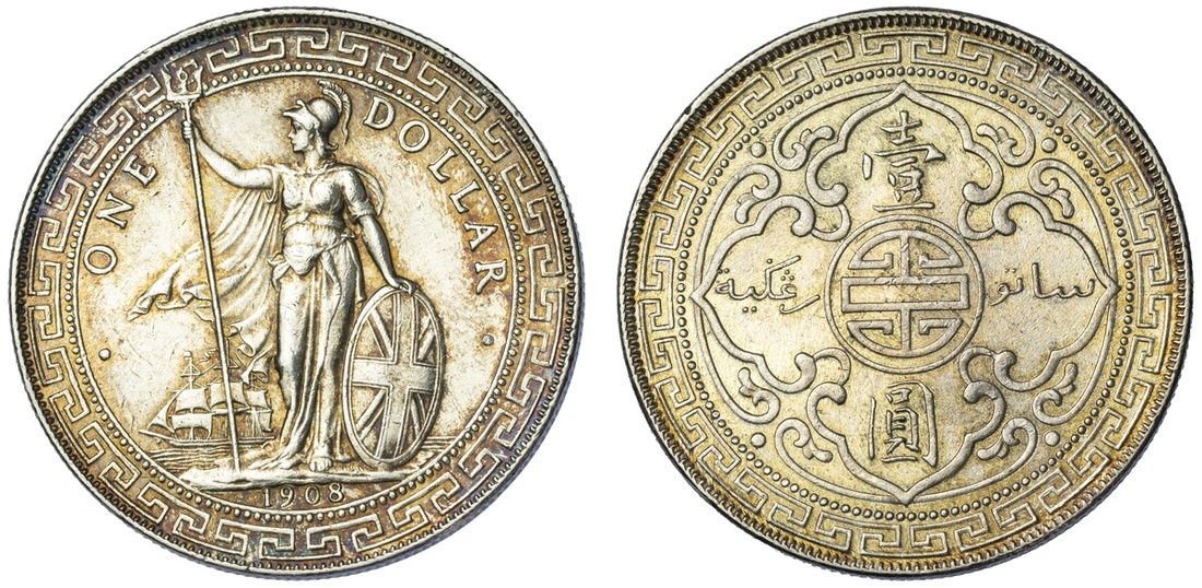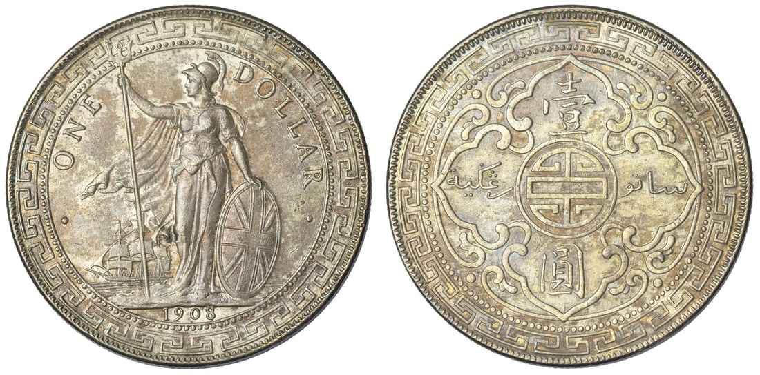 British Overseas Territories, Hong Kong (1895-1935), British Trade Dollar, 1908/7 B, Bombay Mint, by George William de Saulles, Britannia standing left, holding trident, cape billowing behind, date in exergue, rev. Chinese characters and Jawi script in ornamental flower, edge milled, 12h (Mars BTD1; Prid. 18 variety; KM T5), lightly rubbed, otherwise cartwheel lustrous, with a handsome golden peripheral hue, a handsome example, the overdate clear; British Trade Dollar, 1908/7 B, Bombay Mint, by George William de Saulles, Britannia standing left, holding trident, cape billowing behind, date in exergue, rev. Chinese characters and Jawi script in ornamental flower, edge milled, 12h (Mars BTD1; Prid. 18 variety; KM T5), patchy, colourful tone, residually lustrous, a pleasing extremely fine, the overdate beautifully clear (2)
