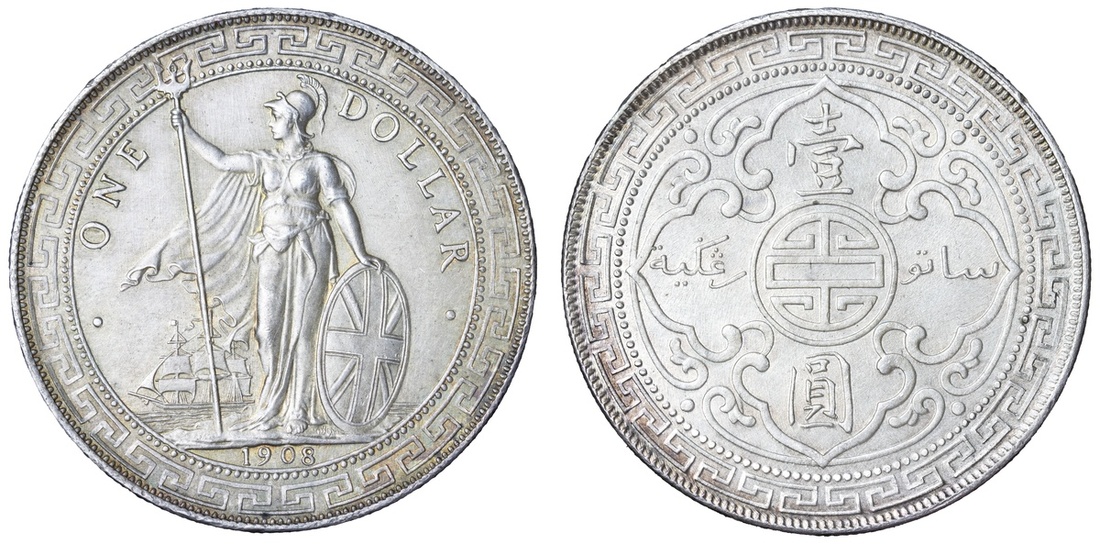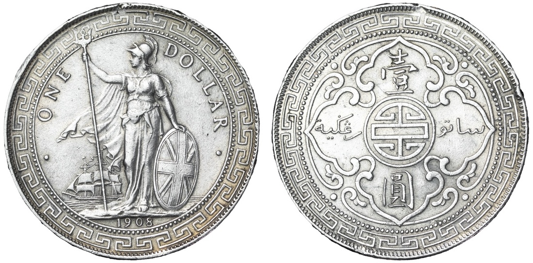 British Overseas Territories, Hong Kong (1895-1935), British Trade Dollar, 1908 B, 'Low 8', Bombay Mint, by George William de Saulles, Britannia standing left, holding trident, cape billowing behind, date in exergue, rev. Chinese characters and Jawi script in ornamental flower, edge milled, 12h (Mars BTD1; Prid. 18; KM T5), lightly wiped with rim marks, otherwise cartwheel lustrous with hints of peripheral tone, about extremely fine; British Trade Dollar, 1908 B, 'Low 8', Bombay Mint, by George William de Saulles, Britannia standing left, holding trident, cape billowing behind, date in exergue, rev. Chinese characters and Jawi script in ornamental flower, edge milled, 12h (Mars BTD1; Prid. 18; KM T5), lightly hairlined, otherwise attractively cabinet retoned, much as struck (2)
