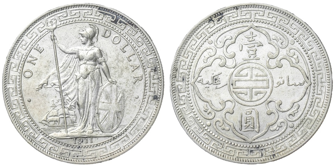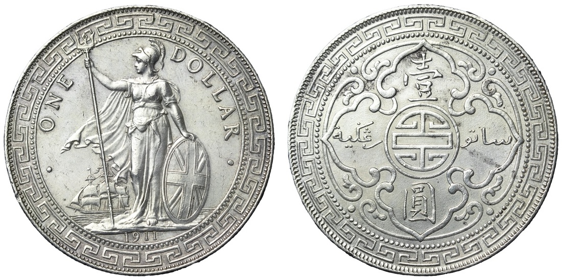 British Overseas Territories, Hong Kong (1895-1935), British Trade Dollar, 1911 B, 'Small 11', Bombay Mint, by George William de Saulles, Britannia standing left, holding trident, cape billowing behind, date in exergue, rev. Chinese characters and Jawi script in ornamental flower, edge milled, 12h (Mars BTD1; Prid. 21; KM T5), lightly wiped otherwise lustrous, near extremely fine; British Trade Dollar, 1911 B, 'Small 11', Bombay Mint, by George William de Saulles, Britannia standing left, holding trident, cape billowing behind, date in exergue, rev. Chinese characters and Jawi script in ornamental flower, edge milled, 12h (Mars BTD1; Prid. 21; KM T5), rub to high points and with patchy peripheral staining, otherwise cartwheel lustrous, a pleasing extremely fine; British Trade Dollar, 1911 B, 'Small 11', Bombay Mint, by George William de Saulles, Britannia standing left, holding trident, cape billowing behind, date in exergue, rev. Chinese characters and Jawi script in ornamental flower, edge milled, 12h (Mars BTD1; Prid. 21; KM T5), lightly cleaned and artificially retoned but residually lustrous, almost extremely fine; British Trade Dollar, 1911 B, 'Small 11', Bombay Mint, by George William de Saulles, Britannia standing left, holding trident, cape billowing behind, date in exergue, rev. Chinese characters and Jawi script in ornamental flower, edge milled, 12h (Mars BTD1; Prid. 21; KM T5), lightly cleaned and hairlined, a bolder very fine (4)