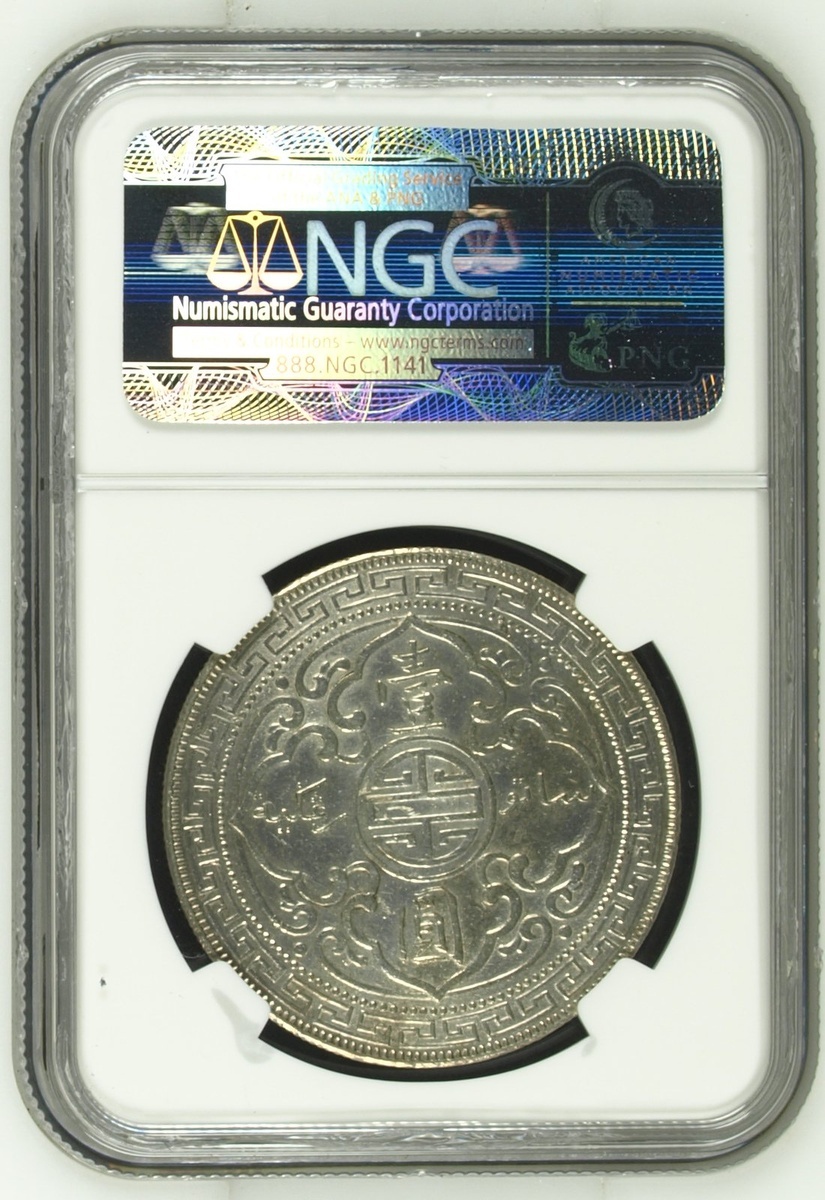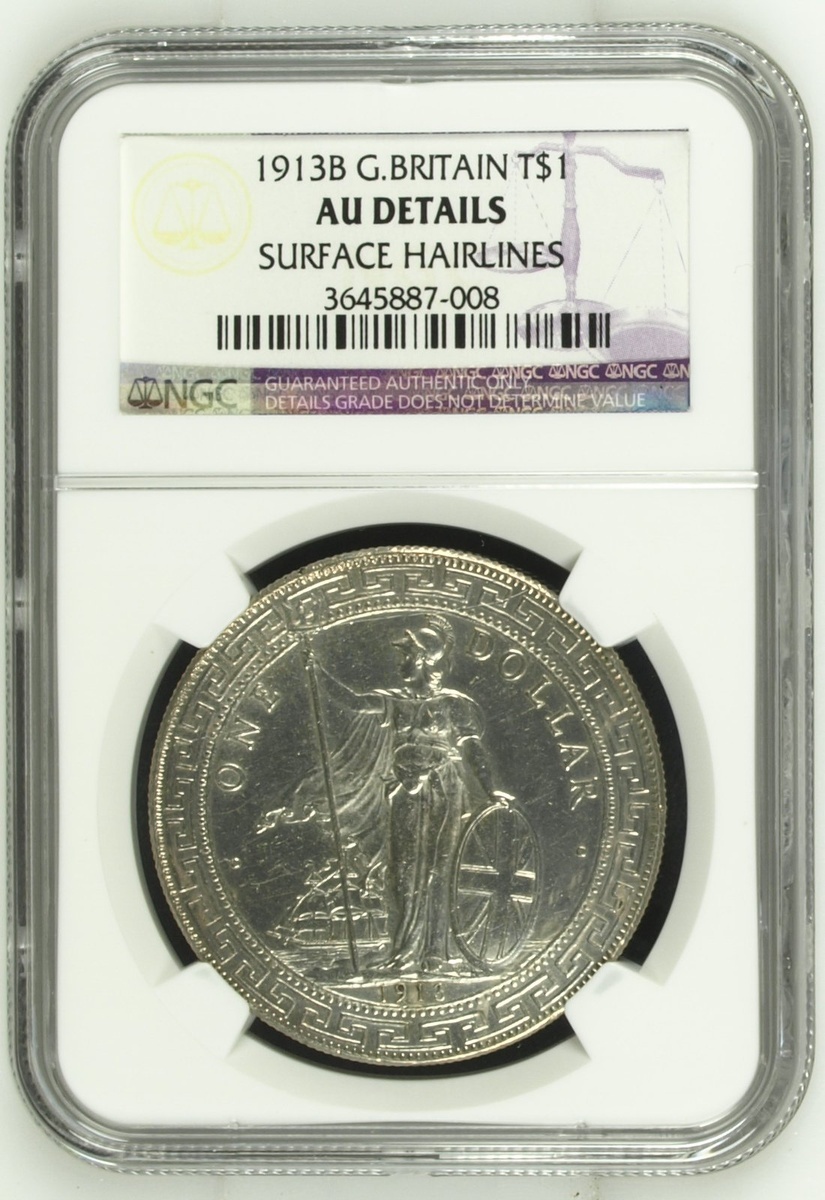 NGC AU | British Overseas Territories, Hong Kong (1895-1935), British Trade Dollar, 1913 B, Bombay Mint, by George William de Saulles, Britannia standing left, holding trident, cape billowing behind, date in exergue, rev. Chinese characters and Jawi script in ornamental flower, edge milled, 12h (Mars BTD1; Prid. 23; KM T5), lightly cleaned, but residually lustrous, almost extremely fine, in NGC holder, graded AU DETAILS ~ Surface Hairlines (Cert. #3645887-008); British Trade Dollar, 1913 B, Bombay Mint, by George William de Saulles, Britannia standing left, holding trident, cape billowing behind, date in exergue, rev. Chinese characters and Jawi script in ornamental flower, edge milled, 12h (Mars BTD1; Prid. 23; KM T5), harshly cleaned with hairlines, residually lustrous, very fine, the reverse bolder (2)