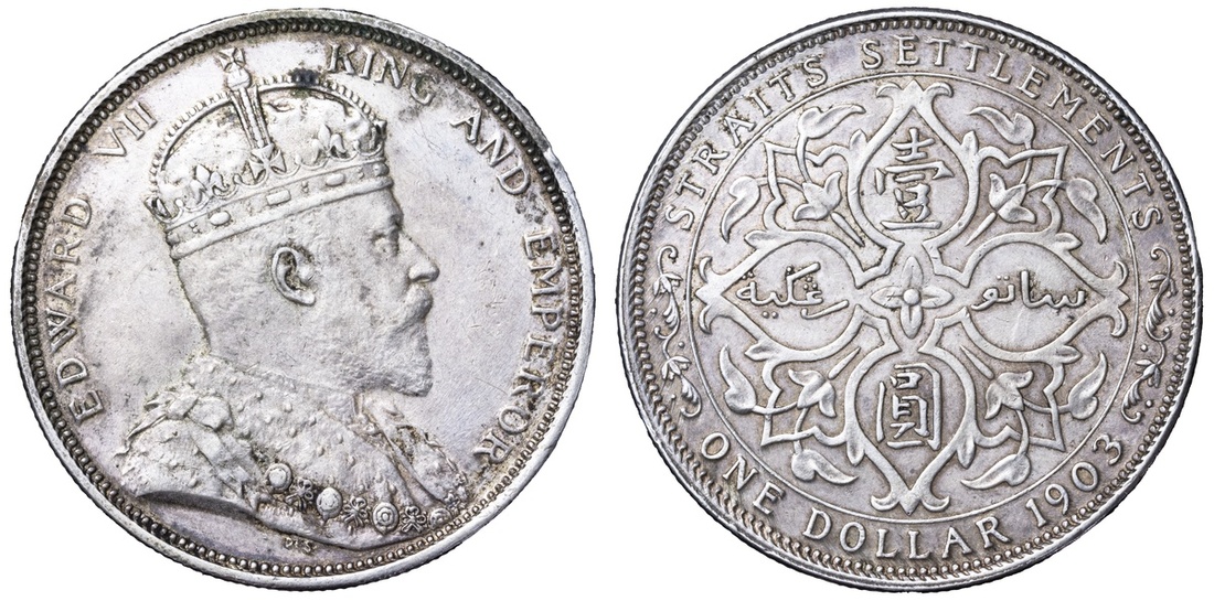 NGC AU55 | Straits Settlements, Edward VII (1901-1910), Dollar, 1903 B [Incuse on Crown Ornament], Normal Date Spacing, Bombay Mint, by George William De Saulles, EDWARD VII - KING AND EMPEROR, Coronation bust right, DE S below truncation, rev. STRAITS SETTLEMENTS | ONE DOLLAR 1903, floral voided quadrilobe, edge milled, 12h, 26.97g (Prid. 1; KM 25), some rim marks and staining, otherwise residually lustrous with a hint of toning, almost extremely fine, in NGC holder, graded AU55 (Cert. #8222301-001)
