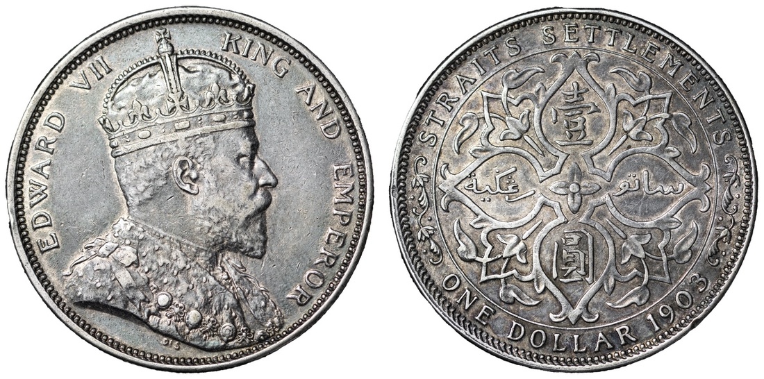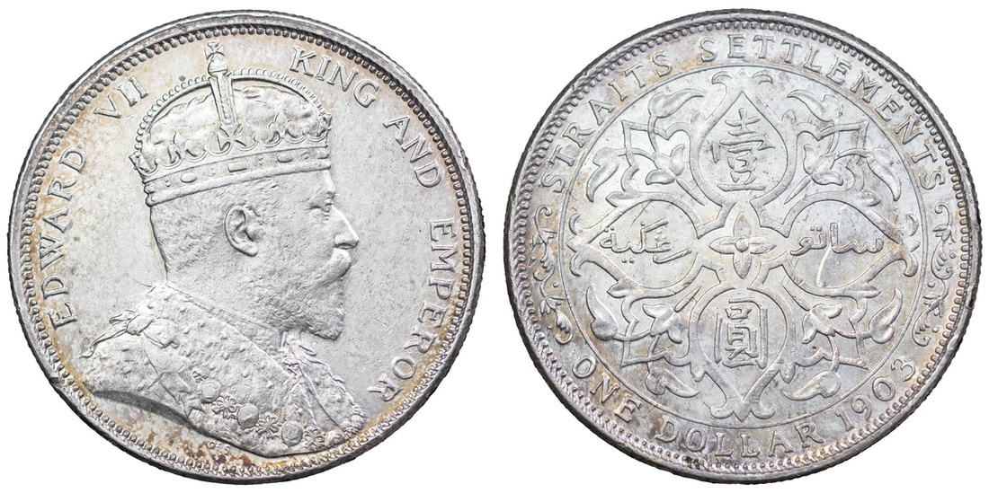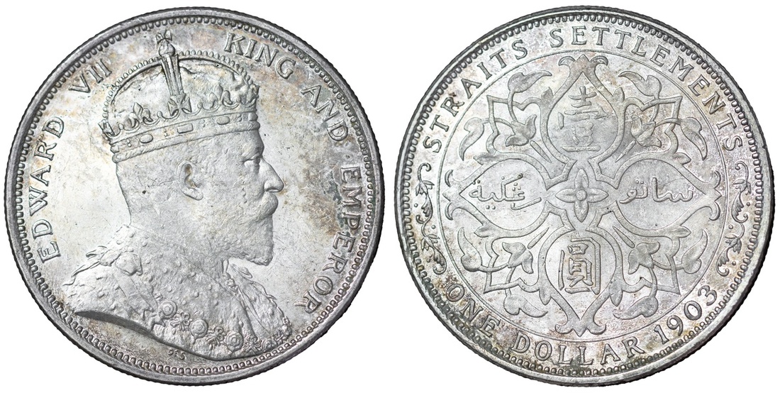 Straits Settlements, Edward VII (1901-1910), Dollar, 1903 B [Incuse on Crown Ornament], Normal Date Spacing, Bombay Mint, by George William De Saulles, EDWARD VII - KING AND EMPEROR, Coronation bust right, DE S below truncation, rev. STRAITS SETTLEMENTS | ONE DOLLAR 1903, floral voided quadrilobe, edge milled, 12h (Prid. 1; KM 25), minor rim nicks, otherwise faint bagmarks in otherwise cartwheel lustrous original fields, a pleasingly bold extremely fine; Dollar, 1903 B [Incuse on Crown Ornament], Normal Date Spacing, Bombay Mint, by George William De Saulles, EDWARD VII - KING AND EMPEROR, Coronation bust right, DE S below truncation, rev. STRAITS SETTLEMENTS | ONE DOLLAR 1903, floral voided quadrilobe, edge milled, 12h (Prid. 1; KM 25), dragmark on cheek, otherwise handsomely choice with wisps of peripheral toning, much as struck; Dollar, 1903 B [Incuse on Crown Ornament], Normal Date Spacing, Bombay Mint, by George William De Saulles, EDWARD VII - KING AND EMPEROR, Coronation bust right, DE S below truncation, rev. STRAITS SETTLEMENTS | ONE DOLLAR 1903, floral voided quadrilobe, edge milled, 12h (Prid. 1; KM 25), rubbed but with darker cabinet tone, a pleasing very fine, the reverse bolder (3)