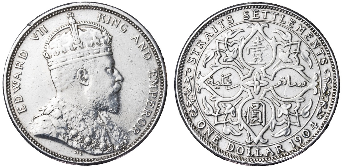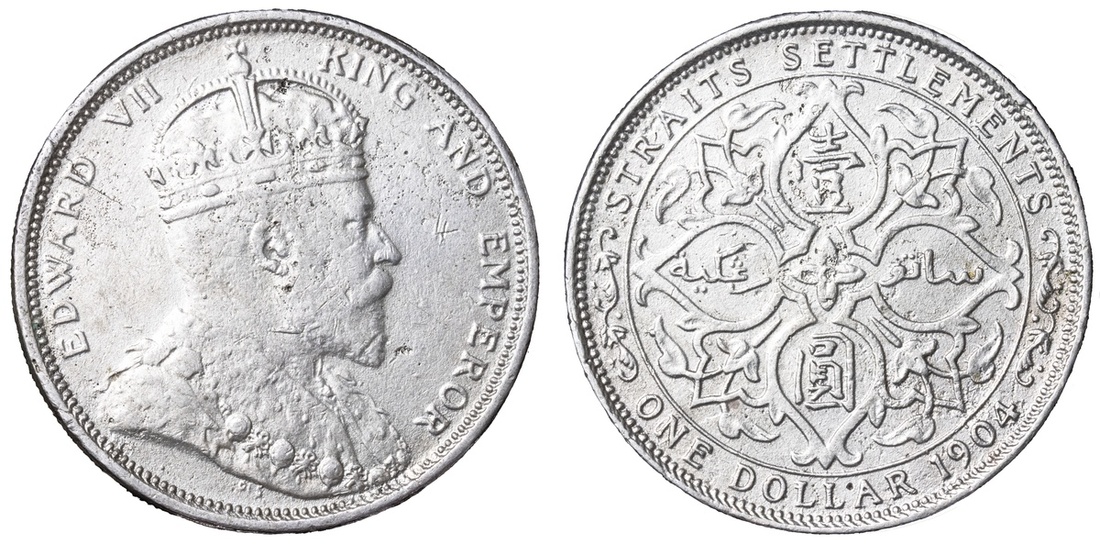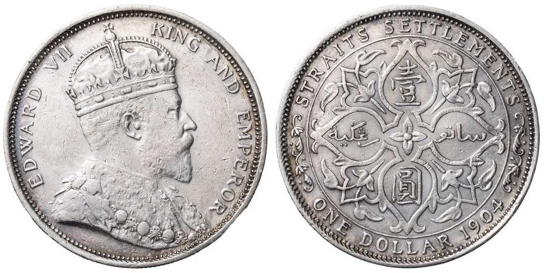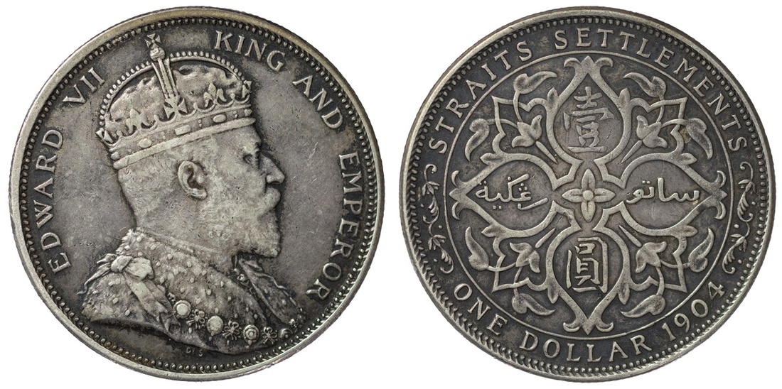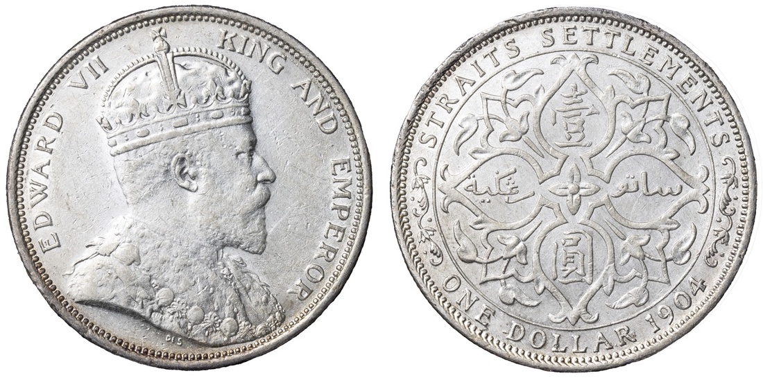 Straits Settlements, Edward VII (1901-1910), Dollar, 1904 B [Incuse on Crown Ornament], Normal Date Spacing, Bombay Mint, by George William De Saulles, EDWARD VII - KING AND EMPEROR, Coronation bust right, DE S below truncation, rev. STRAITS SETTLEMENTS | ONE DOLLAR 1904, floral voided quadrilobe, edge milled, 12h (Prid. 4; KM 25), lightly cleaned and bagmarked, otherwise lustrous, a bolder very fine; Dollar, 1904 B [Incuse on Crown Ornament], Normal Date Spacing, Bombay Mint, by George William De Saulles, EDWARD VII - KING AND EMPEROR, Coronation bust right, DE S below truncation, rev. STRAITS SETTLEMENTS | ONE DOLLAR 1904, floral voided quadrilobe, edge milled, 12h (Prid. 4; KM 25), cabinet toned with underlying lustre, good very fine; Dollar, 1904 B [Incuse on Crown Ornament], Normal Date Spacing, Bombay Mint, by George William De Saulles, EDWARD VII - KING AND EMPEROR, Coronation bust right, DE S below truncation, rev. STRAITS SETTLEMENTS | ONE DOLLAR 1904, floral voided quadrilobe, edge milled, 12h (Prid. 4; KM 25), removed from jewellery with sweated surfaces, struck details bolder than very fine; Dollar, 1904 B [Incuse on Crown Ornament], Normal Date Spacing, Bombay Mint, by George William De Saulles, EDWARD VII - KING AND EMPEROR, Coronation bust right, DE S below truncation, rev. STRAITS SETTLEMENTS | ONE DOLLAR 1904, floral voided quadrilobe, edge milled, 12h (Prid. 4; KM 25), lightly cleaned and residually lustrous, a bolder very fine; Dollar, 1904 B [Incuse on Crown Ornament], Normal Date Spacing, Bombay Mint, by George William De Saulles, EDWARD VII - KING AND EMPEROR, Coronation bust right, DE S below truncation, rev. STRAITS SETTLEMENTS | ONE DOLLAR 1904, floral voided quadrilobe, edge milled, 12h (Prid. 4; KM 25), polished, a bolder fine / very fine (5)