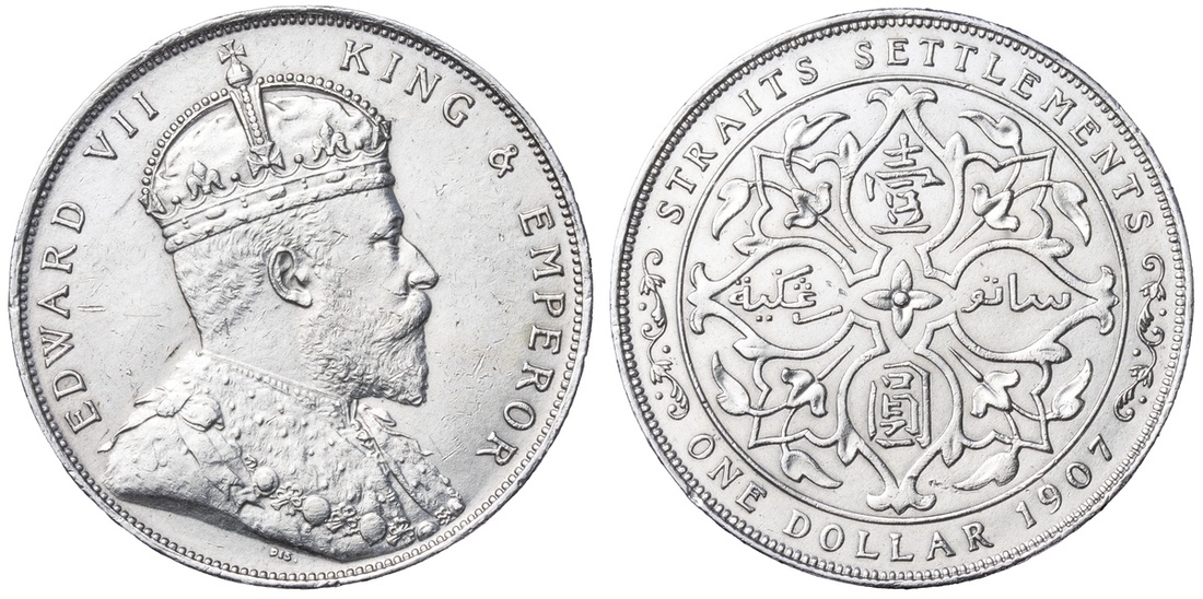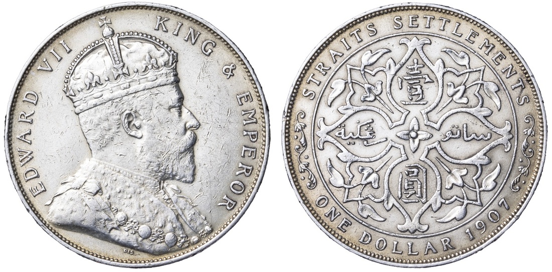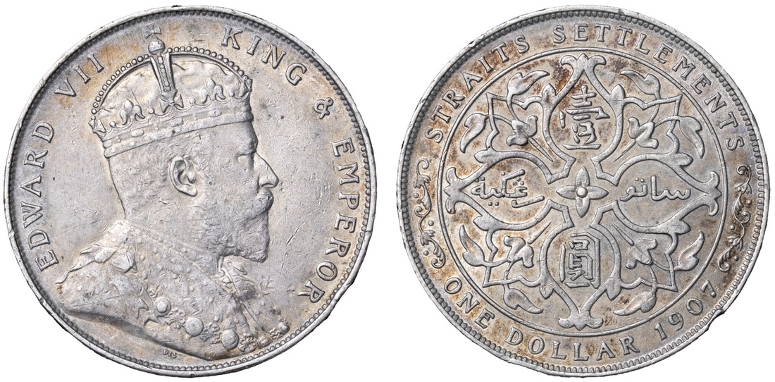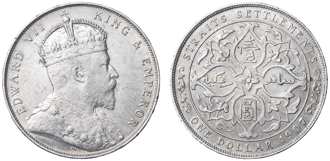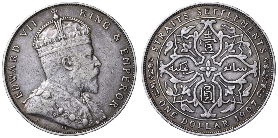 Straits Settlements, Edward VII (1901-1910), Dollar, 1907 H, Normal Date Spacing, Bombay Mint, by George William De Saulles, EDWARD VII - KING AND EMPEROR, Coronation bust right, DE S below truncation, rev. STRAITS SETTLEMENTS | ONE DOLLAR 1907, floral voided quadrilobe, edge milled, 12h (Prid. 6; KM 26), rubbed and toned, very fine or near so; Dollar, 1907, Normal Date Spacing, Bombay Mint, by George William De Saulles, EDWARD VII - KING AND EMPEROR, Coronation bust right, DE S below truncation, rev. STRAITS SETTLEMENTS | ONE DOLLAR 1907, floral voided quadrilobe, edge milled, 12h (Prid. 6; KM 26), lightly cleaned but lustrous, about extremely fine; Dollar, 1907, Normal Date Spacing, Bombay Mint, by George William De Saulles, EDWARD VII - KING AND EMPEROR, Coronation bust right, DE S below truncation, rev. STRAITS SETTLEMENTS | ONE DOLLAR 1907, floral voided quadrilobe, edge milled, 12h (Prid. 6; KM 26), cleaned and bagmarked but residually lustrous, a really bold very fine; Dollar, 1907, Normal Date Spacing, Bombay Mint, by George William De Saulles, EDWARD VII - KING AND EMPEROR, Coronation bust right, DE S below truncation, rev. STRAITS SETTLEMENTS | ONE DOLLAR 1907, floral voided quadrilobe, edge milled, 12h (Prid. 6; KM 26), lightly wiped but residually toned and lustrous, a bolder very fine; Dollar, 1907, Normal Date Spacing, Bombay Mint, by George William De Saulles, EDWARD VII - KING AND EMPEROR, Coronation bust right, DE S below truncation, rev. STRAITS SETTLEMENTS | ONE DOLLAR 1907, floral voided quadrilobe, edge milled, 12h (Prid. 6; KM 26), minor edge bruising and lightly toned with residual lustre, a bolder very fine (5)