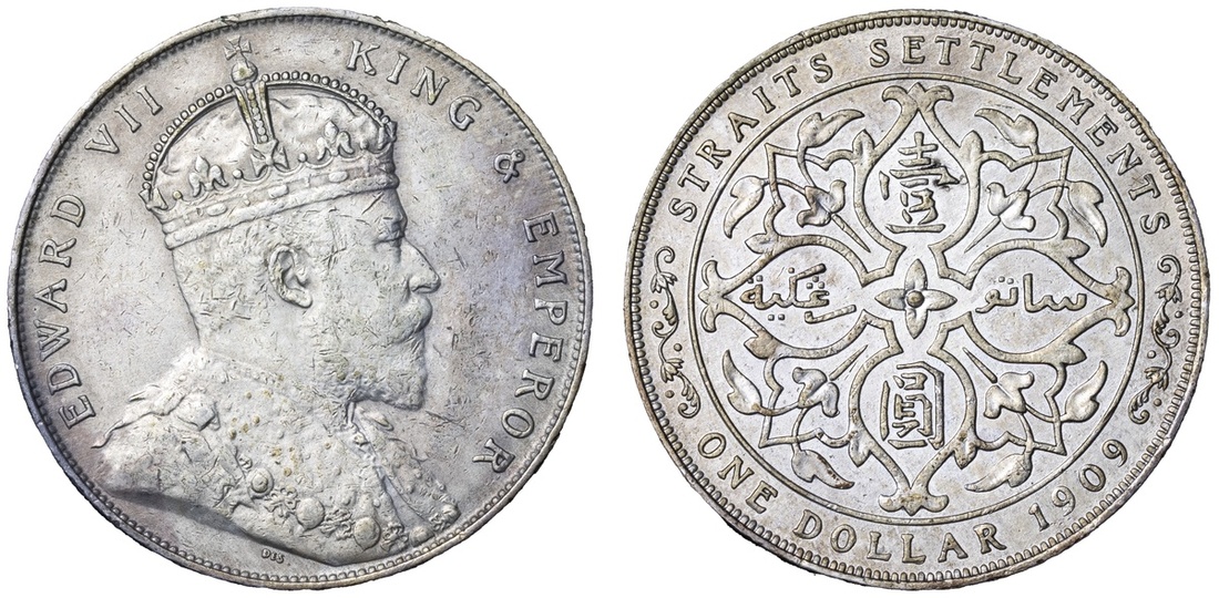 Straits Settlements, Edward VII (1901-1910), Dollar, 1909, London Mint, by George William De Saulles, EDWARD VII - KING AND EMPEROR, Coronation bust right, DE S below truncation, rev. STRAITS SETTLEMENTS | ONE DOLLAR 1909, floral voided quadrilobe, edge milled, 12h (Dav. 304; Prid. 8; KM 26), stained and bagmarked but lustrous, a really bold very fine / extremely fine, a scarcer date of issue