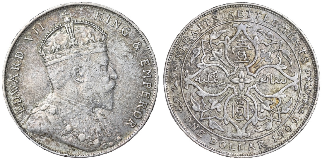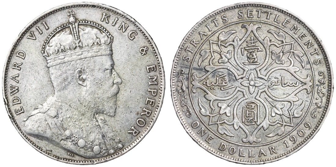 Straits Settlements, Edward VII (1901-1910), Dollar, 1909, London Mint, by George William De Saulles, EDWARD VII - KING AND EMPEROR, Coronation bust right, DE S below truncation, rev. STRAITS SETTLEMENTS | ONE DOLLAR 1909, floral voided quadrilobe, edge milled, 12h (Dav. 304; Prid. 8; KM 26), rubbed and bagmarked, otherwise lightly toned and lustrous, very fine, the reverse bolder; Dollar, 1909, London Mint, by George William De Saulles, EDWARD VII - KING AND EMPEROR, Coronation bust right, DE S below truncation, rev. STRAITS SETTLEMENTS | ONE DOLLAR 1909, floral voided quadrilobe, edge milled, 12h (Dav. 304; Prid. 8; KM 26), rim marked, otherwise lightly toned and lustrous, a bold very fine (2)