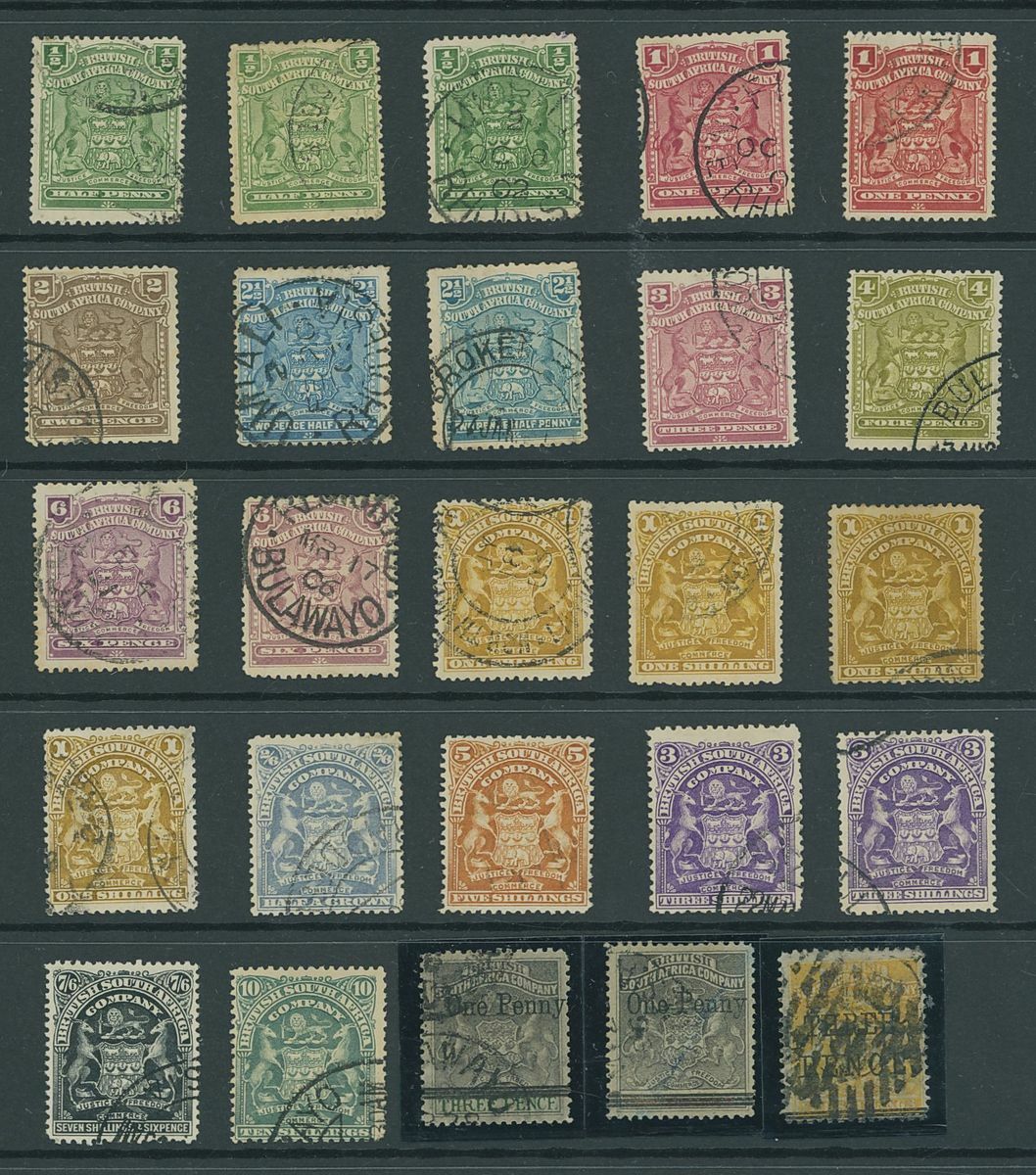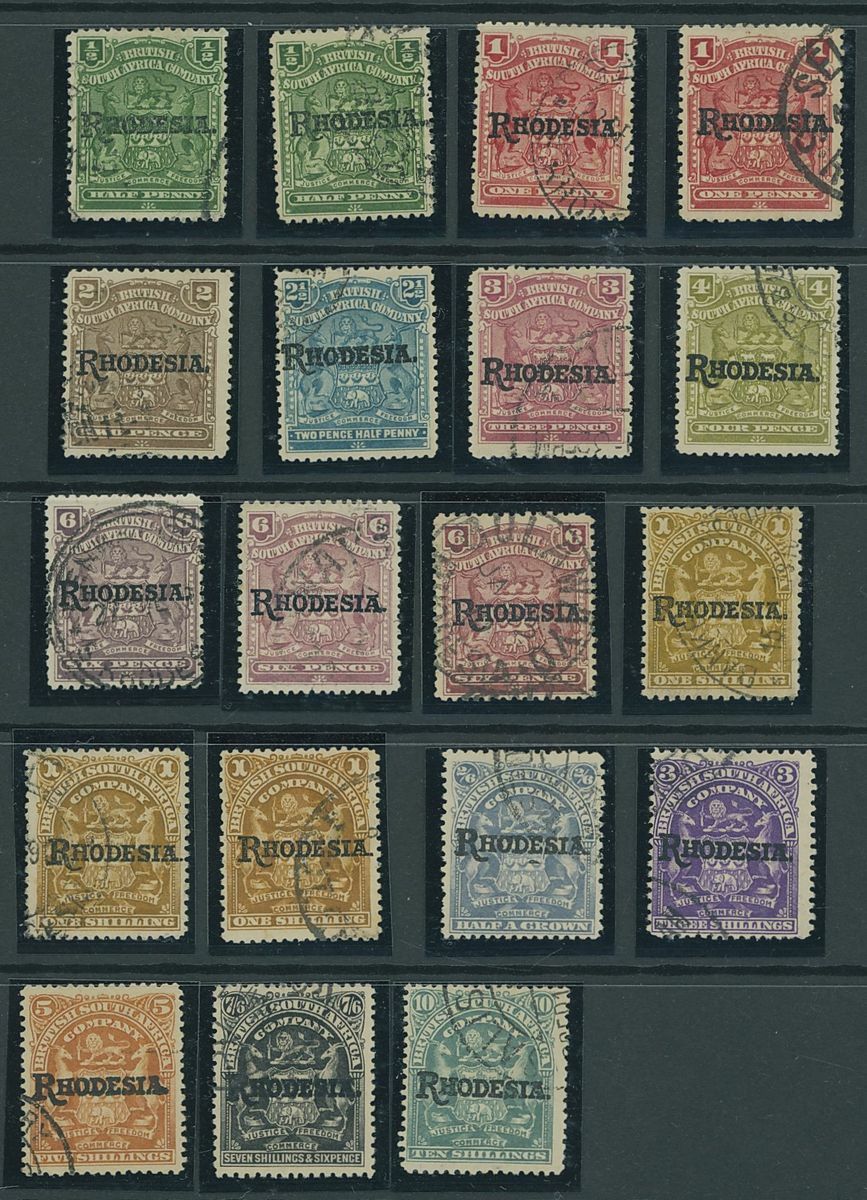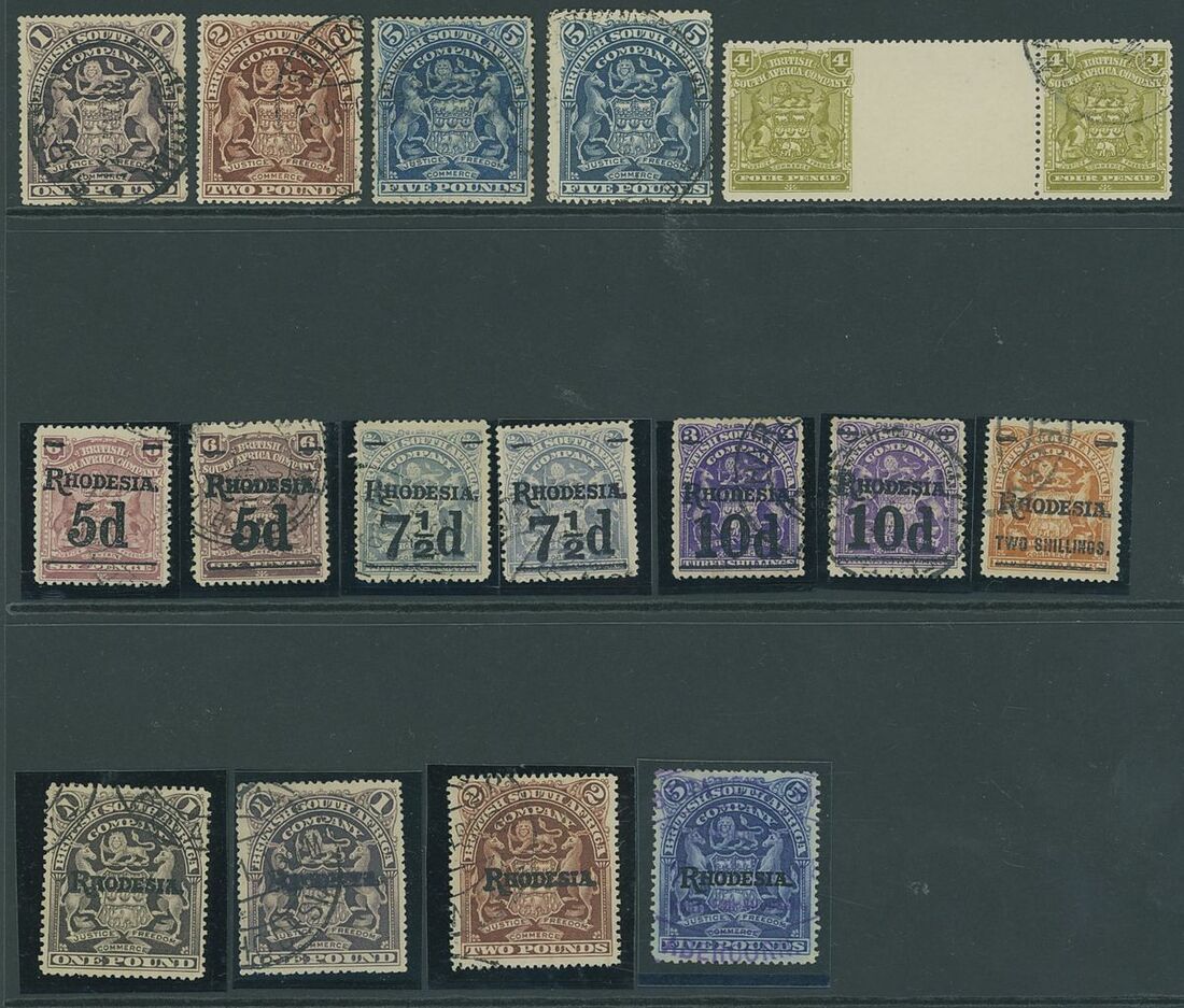 1896-1911 used group on Hagner pages comprising 1896 Matabele Provisionals, 1898-1908 set to £5 and including 4d. imperforate to interpanneau margin, 1909 Rhodesia overprint set to £5 and 1909-11 Surcharges; good to fine
