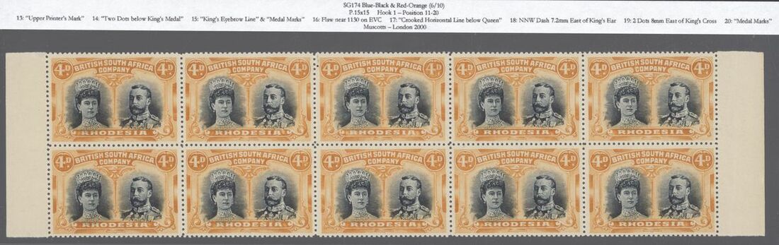 4d. blue-black and red-orange, hook headplate, block of ten with margins at either side [11-20], showing a range of important flaw including [13] upper printer's mark, [14] two dots below King's medal, [15] King's eyebrow line and medal marks and [20] medal marks; mounted on one stamp only. S.G. 174