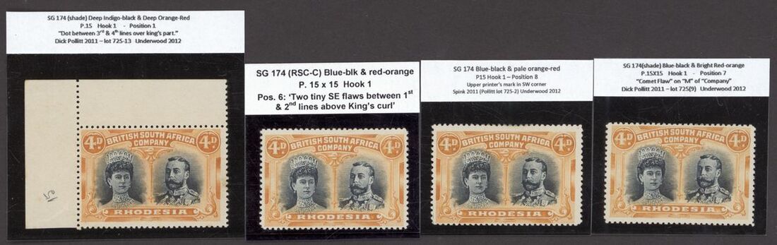 4d. blue-black and red-orange, hook headplate, four mint plated examples comprising [1] upper left mint example, [6], [7] and [8]; fine mint. S.G. 174