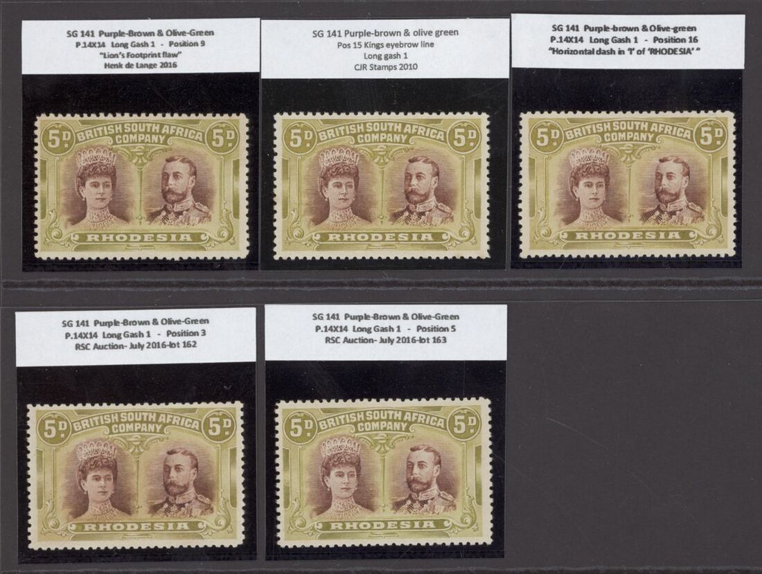 5d. purple-brown and olive-green, long gash headplate, five plated examples (5) comprising [3], [5], [9], [15] showing King's eyebrow line and [16]; good to fine mint. S.G. 141 group
