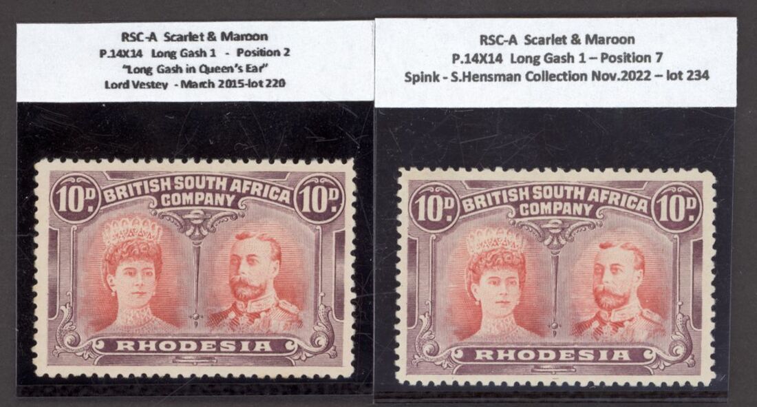 10d. scarlet and maroon, long gash headplate, two plated examples, [2] showing long gash in Queen's ear and [7]; large part original gum, fine. RSC A