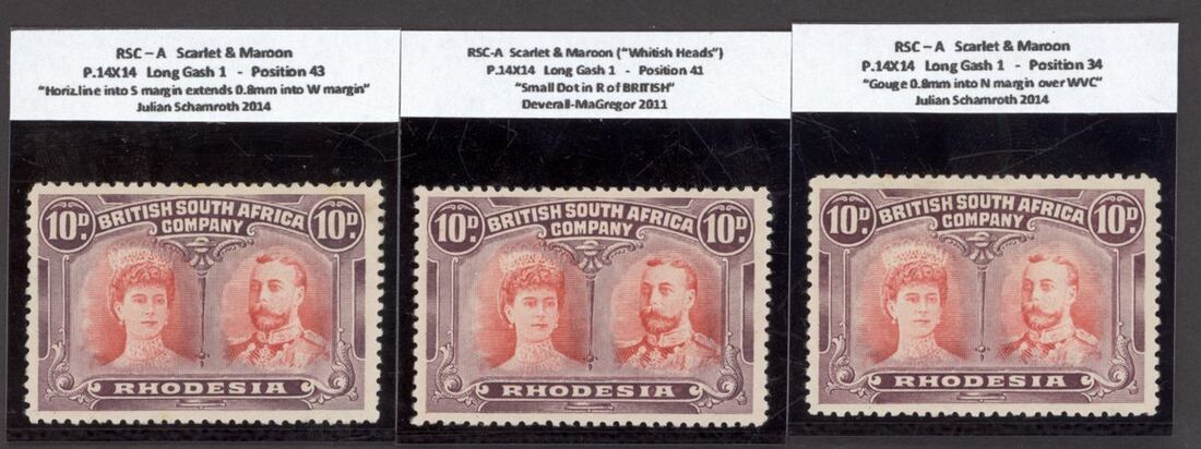 10d. scarlet and maroon, long gash headplate, three plated examples comprising [34], [41] and [43], large part original gum; fine. RSC A