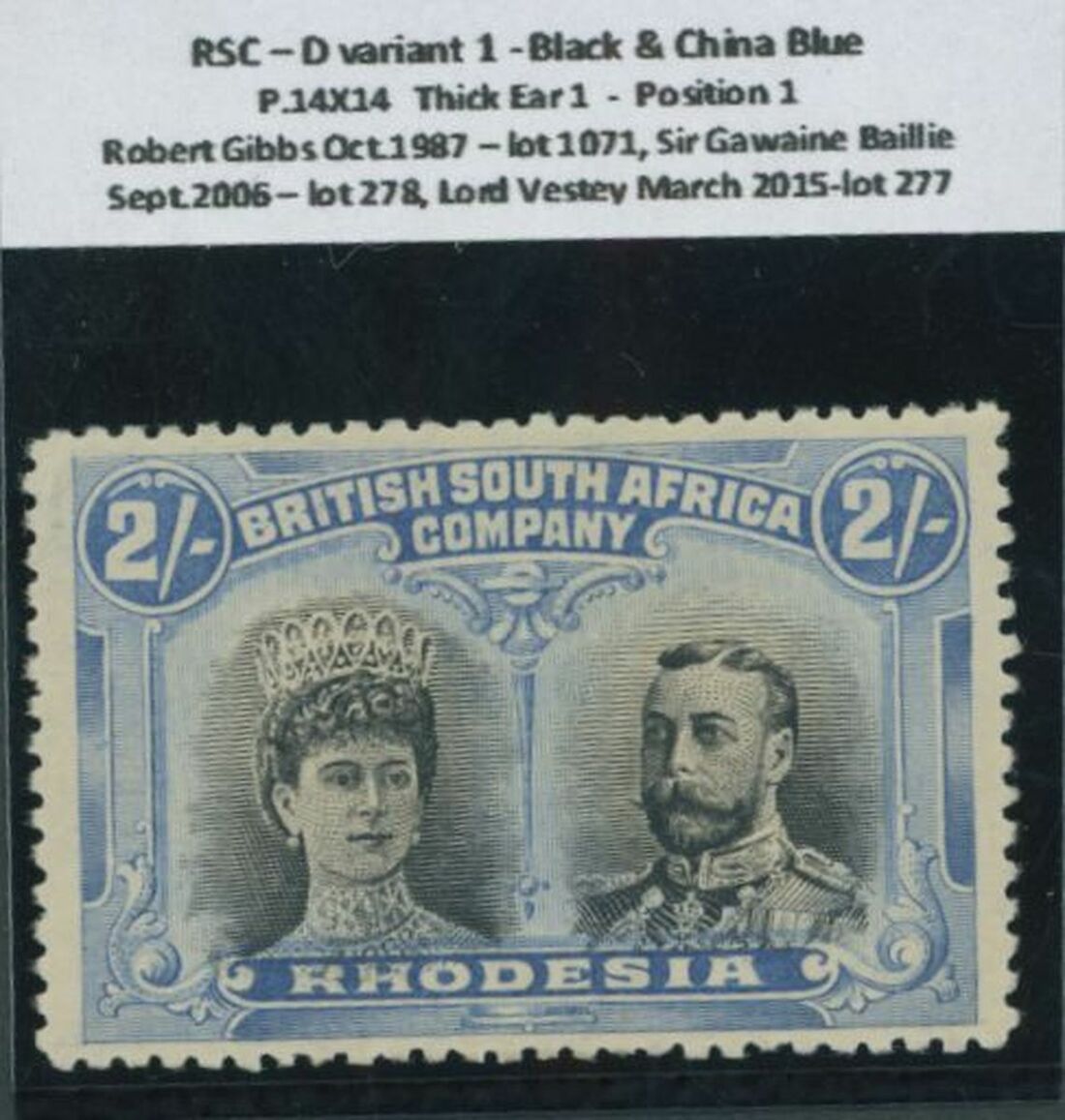 2/- black and china blue, thick ear headplate, [1], large part original gum; fine and scarce. RSC D variant 1