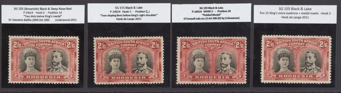 2/6d. black and lake, hook headplate, four plated examples comprising [14], [15] showing King's extra eyebrow, [21] and [26]; fine mint. S.G. 155