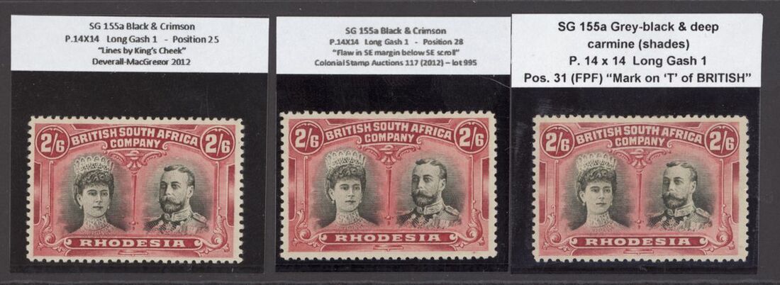 2/6d. black and crimson, long gash headplate, three plated examples comprising [25] showing lines by King's cheek, [28] and [31]; fine mint. S.G. 155a