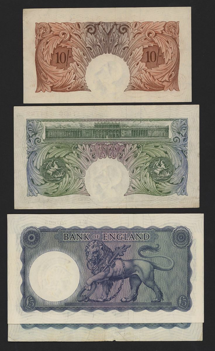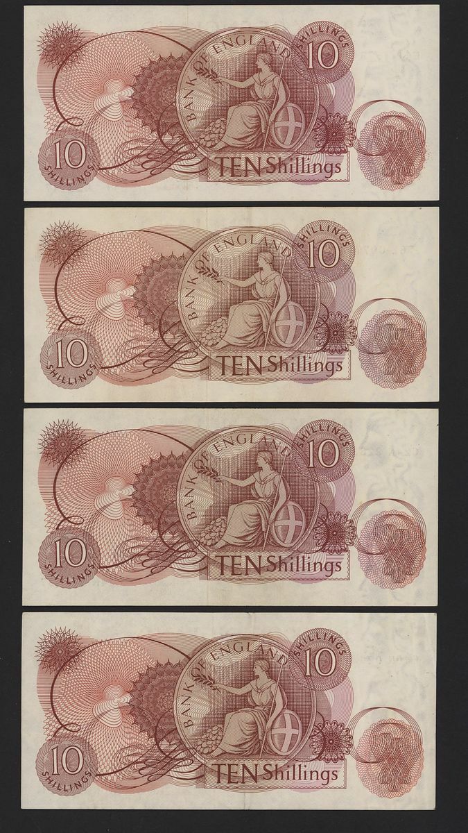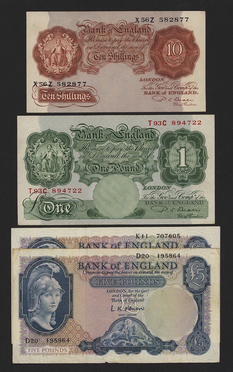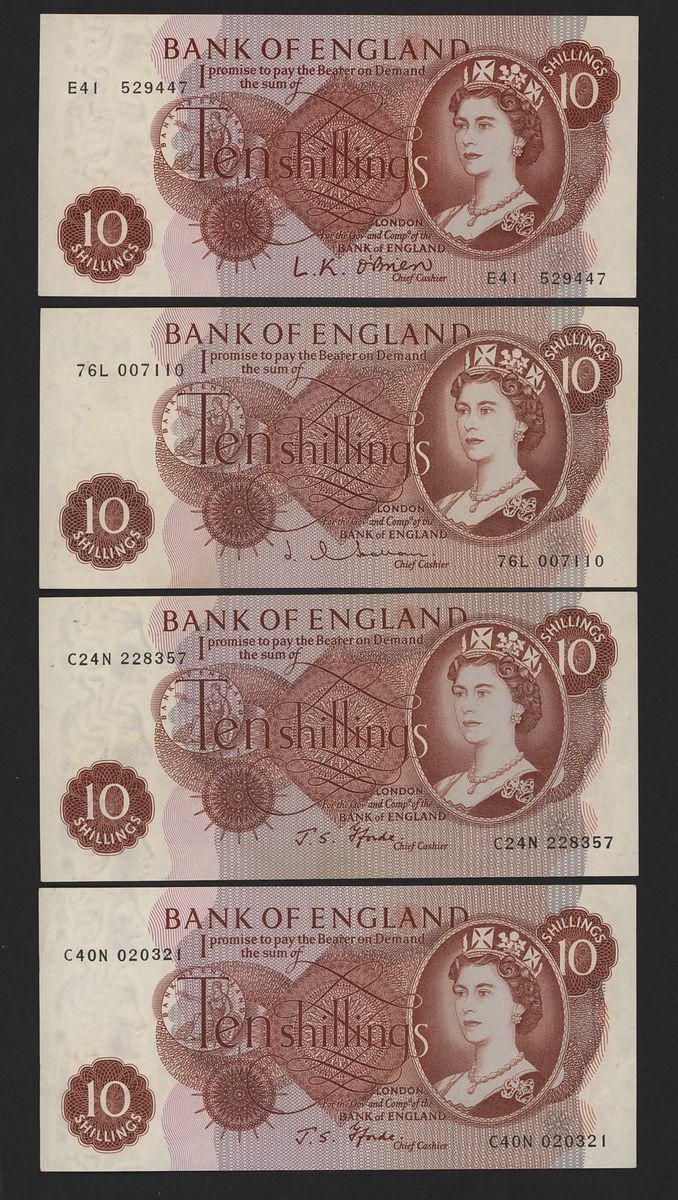 10 Shillings (5): Beale, ND (1950), serial number X56Z 582877; O'Brien, ND (1961), serial number E41 529447; Hollom, ND (1963), serial number 76L 007110; Fforde, ND (1967), serial numbers C24N 228357 and C40N 020321;