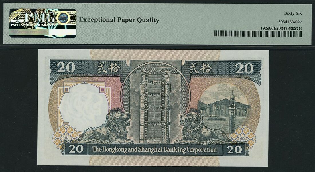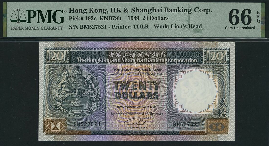 (x) HK & Shanghai Banking Corp., Hong Kong, $20, 1st January 1989, serial number BM527521, (Pick 192c), in PMG holder 66 EPQ Gem Uncirculated