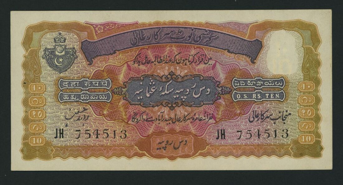 India Princely States, Hyperbad, 10 Rupees, serial number JH 754513, (Pick S274e), good extremely fine, staple holes