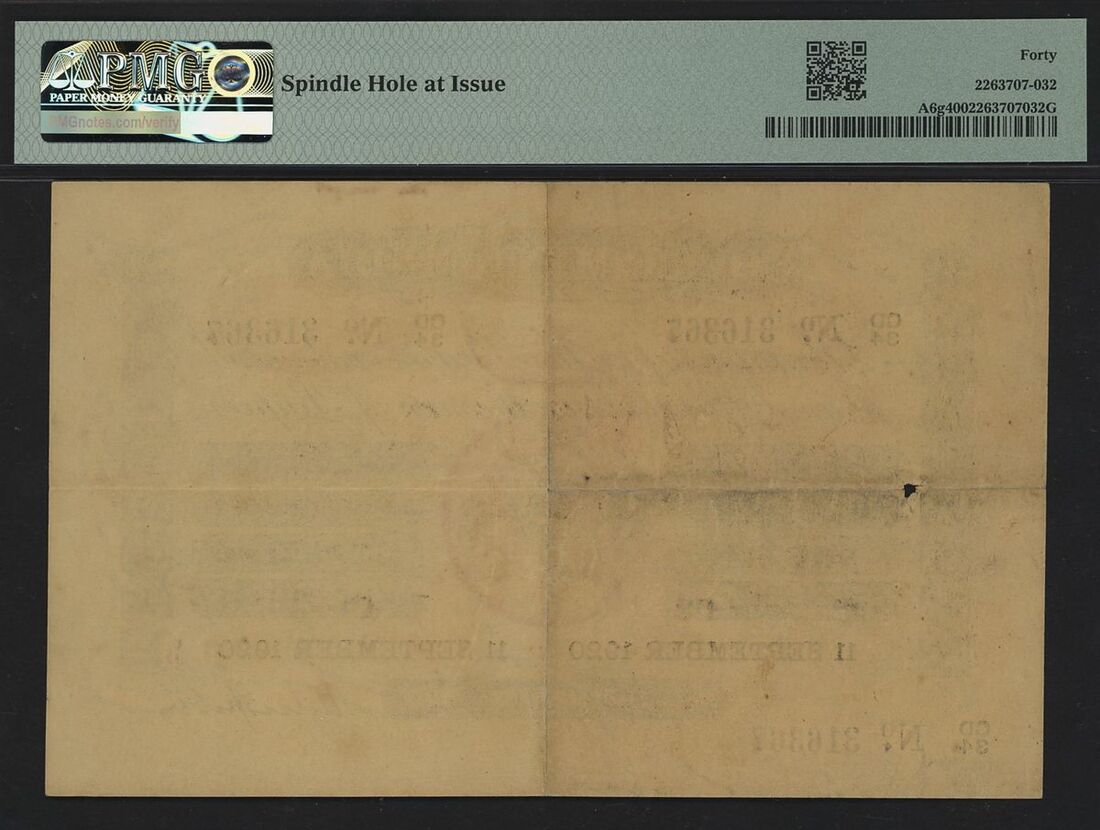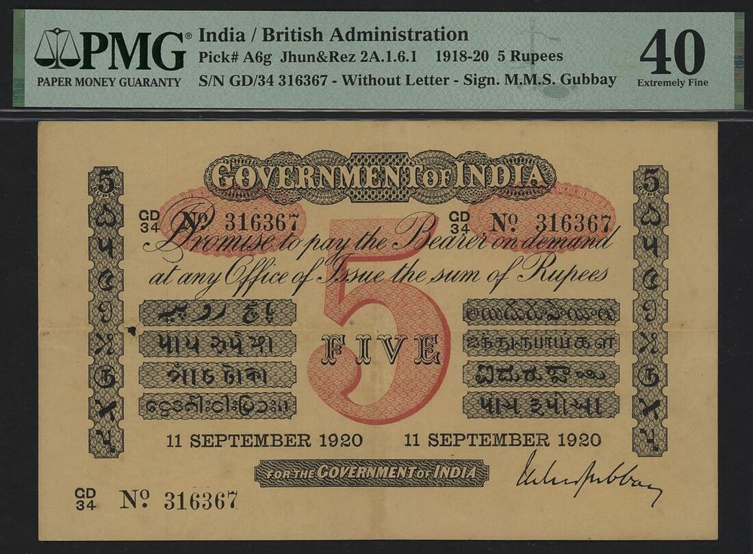 (x) Government of India, 5 Rupees, 11 September 1920, serial number GD/34 316367, (Pick A6g, Jhun&Rez 2A.1.6.1), in PMG holder 40 Extremely Fine, spindle hole at issue