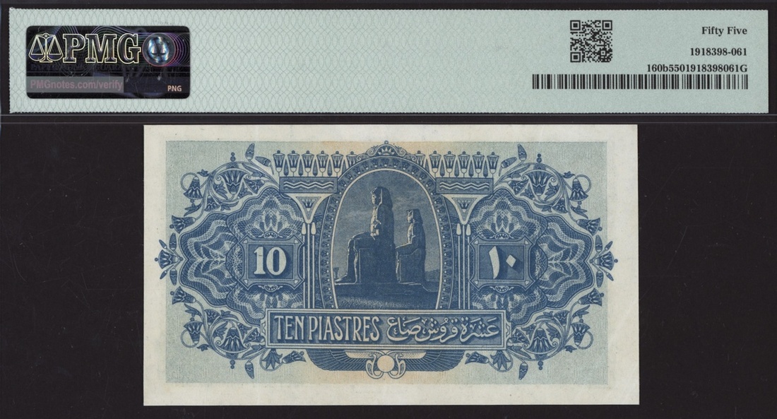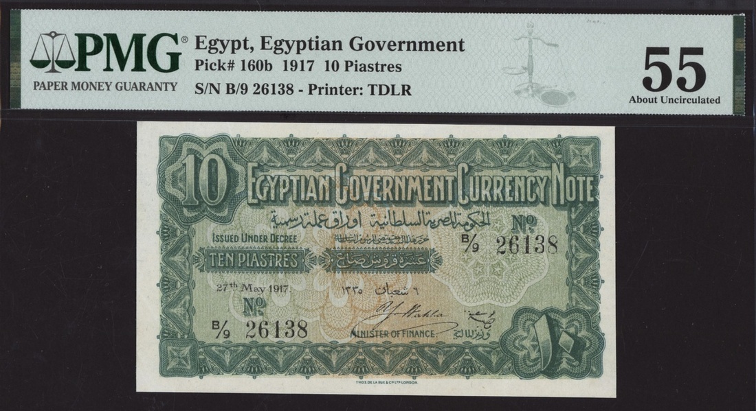 (x) Egyptian Government, 10 Piastres, 27th May 1917, serial number B/9 26138, (Pick 160b, BNB 206b), in PMG holder 55 About Uncirculated
